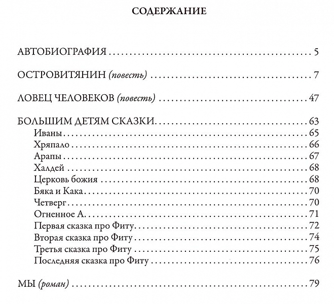 Помимо самого известного произведения Замятина — авангардного для своего времени романа «Мы», который стал предтечей всех последующих антиутопий XX в., сборник включает автобиографию писателя, повести «Островитяне» и «Ловец человеков», в которых едко высмеиваются ограниченность жизненного уклада, консерватизм, снобизм и чопорность англичан, а также дюжину сказок для взрослых, которые были написаны в период с 1917 по 1920 гг. В них оригинальный язык писателя звучит также ярко, как и в его антиутопии «Мы». Роман «Мы» в этом сборнике проиллюстрирован рисунками современного художника Веры Дубровской.
