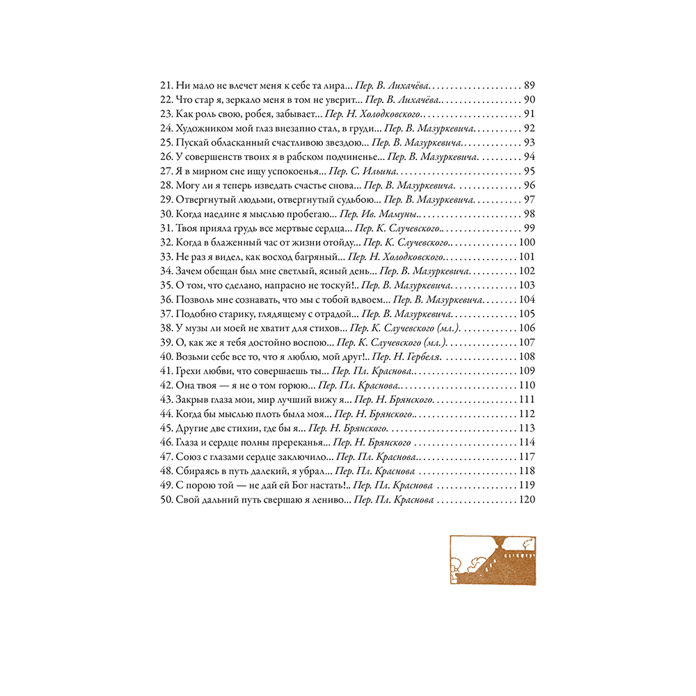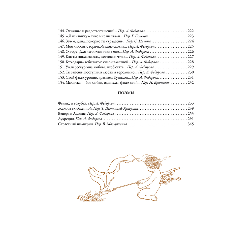 Сборник произведений Вильяма Шекспира (1564–1616) в переводах различных литераторов включает сто пятьдесят четыре сонета, тридцать семь песен, а также пять поэм: «Феникс и голубка», «Жалоба влюбленной», «Венера и Адонис», «Лукреция» и «Страстный пилигрим».