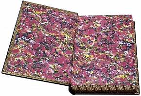 Художественный кожаный переплет, индивидуальный дизайн оформления. Тиснение рельефное и цветное на обложке, корешке и дублюре. Отпечатана на дизайнерской бумаге с тематическим оформлением. На обрезы блока страниц, также нанесены стилизованные изображения игральных карт. К произведению "Пиковая дама" мы добавили не менее интересное произведение А. С. Пушкина "Дубровский".