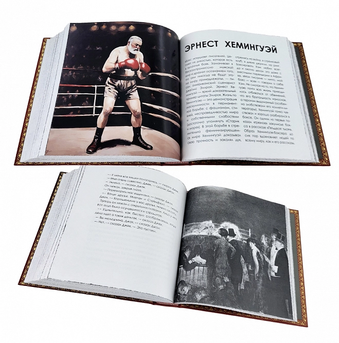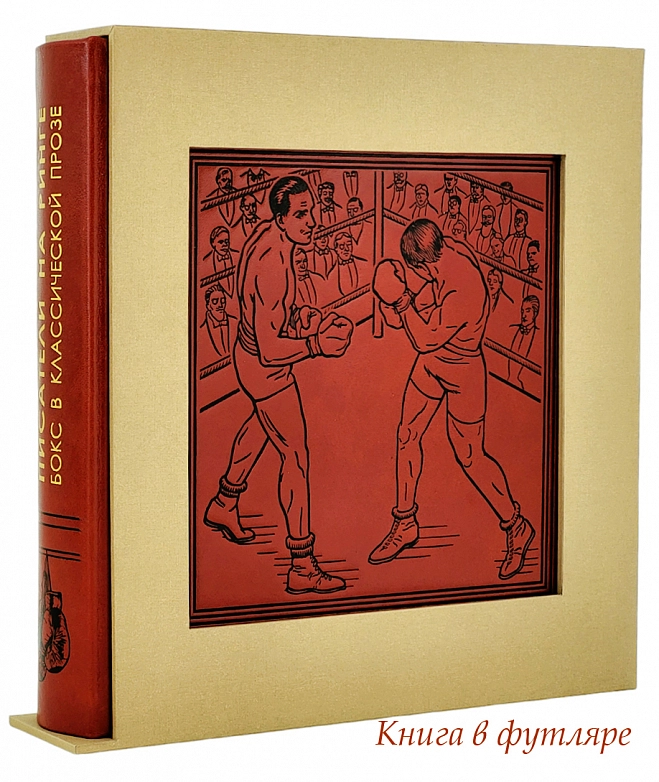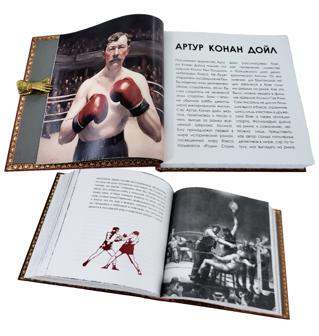 Подарочная книга "Писатели на ринге" АННОТАЦИЯ В книге представлены боксерские рассказы Артура Конан Дойля, О’Генри, Эрнеста Хемингуэя и других писателей. Яркие иллюстрации делают чтение еще более увлекательным и может заинтересовать как взрослых читателей, так и юных любителей бокса.. ОПИСАНИЕ Блоки отпечатаны на дизайнерской бумаге. Ручное шитье блока на шнуры. Переплет из натуральной кожи выполнен вручную. Дублюра (форзац) окатана серебристым бордюрным орнаментом. Блоки торшонированы с трех сторон. Художественное тиснение на обложках и корешках. Особенностью данного издания является крупный, удобочитаемый шрифт. Книга помещена в футляр оригинальной формы.