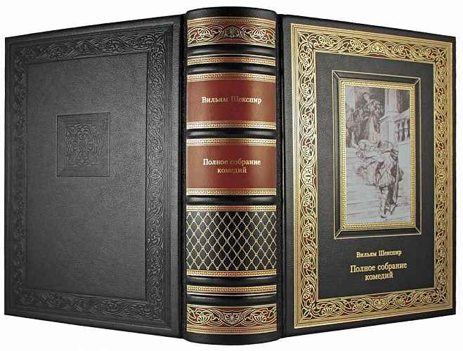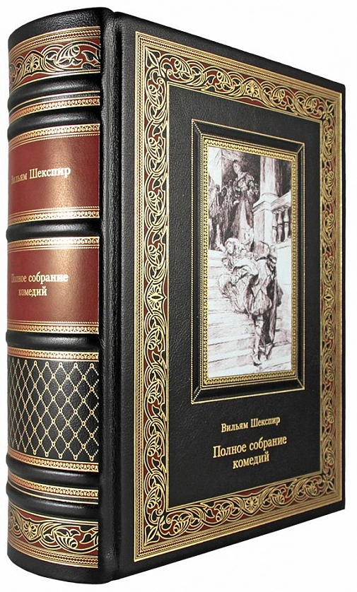 Подарочная книга "Полное собрание комедий" Шекспир Вильям АННОТАЦИЯ В книге собраны все четырнадцать комедий Вильяма Шекспира, среди которых есть и откровенно озорные произведения, и трагикомедии, и пьесы с весьма горьким юмором. Такие комедии сборника как «Много шума из ничего», «Двенадцатая ночь», «Укрощение строптивой» и другие давно входят в золотой фонд мировой литературы. В них можно найти все оттенки юмора и комизма — от тонкого и изящного до площадного и балаганного. Тексты украшают прекрасные рисунки американского художника XIX в. Эдвина Эбби. В его работах живость замысла, фантазия и поэтическое восприятие мира сочетается с великолепной техникой и изящными композиционными построениями. ОПИСАНИЕ Классический европейский переплёт ручной работы из натуральной кожи. Форзац из дизайнерской бумаги Malmero с тиснением орнамента золотой фольгой. 6 бинтов на корешке, ручной обработки. Каптал золотой из натуральной кожи. Обрез блока - золото с торшонированием. Тиснение блинтовое, золотой и цветной фольгой. Ляссе. Инкрустация кожаной вставкой с полноцветной печатью. Вес 1950г