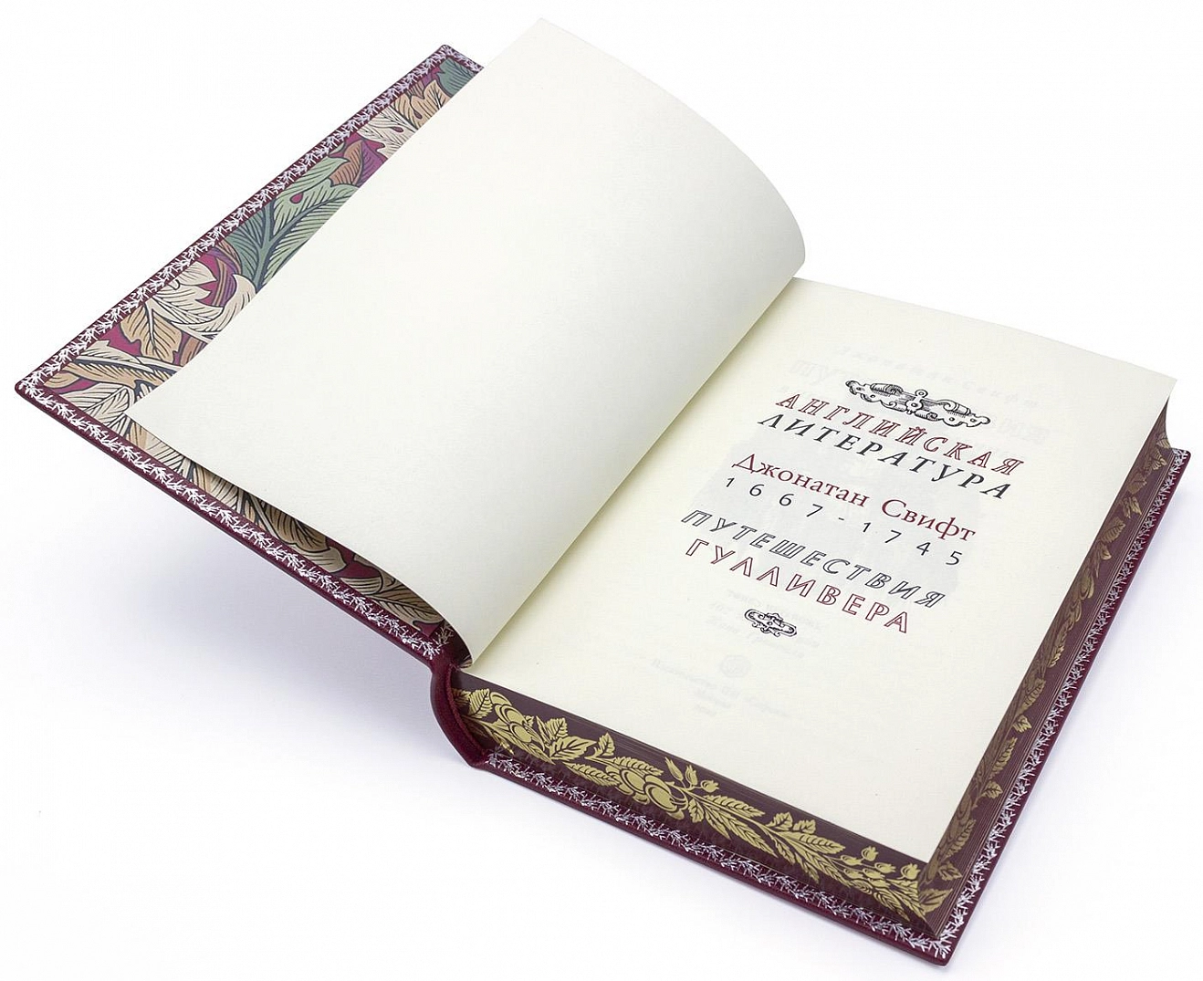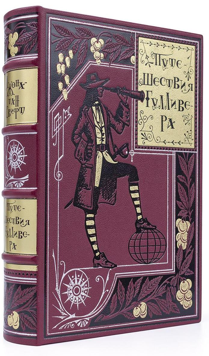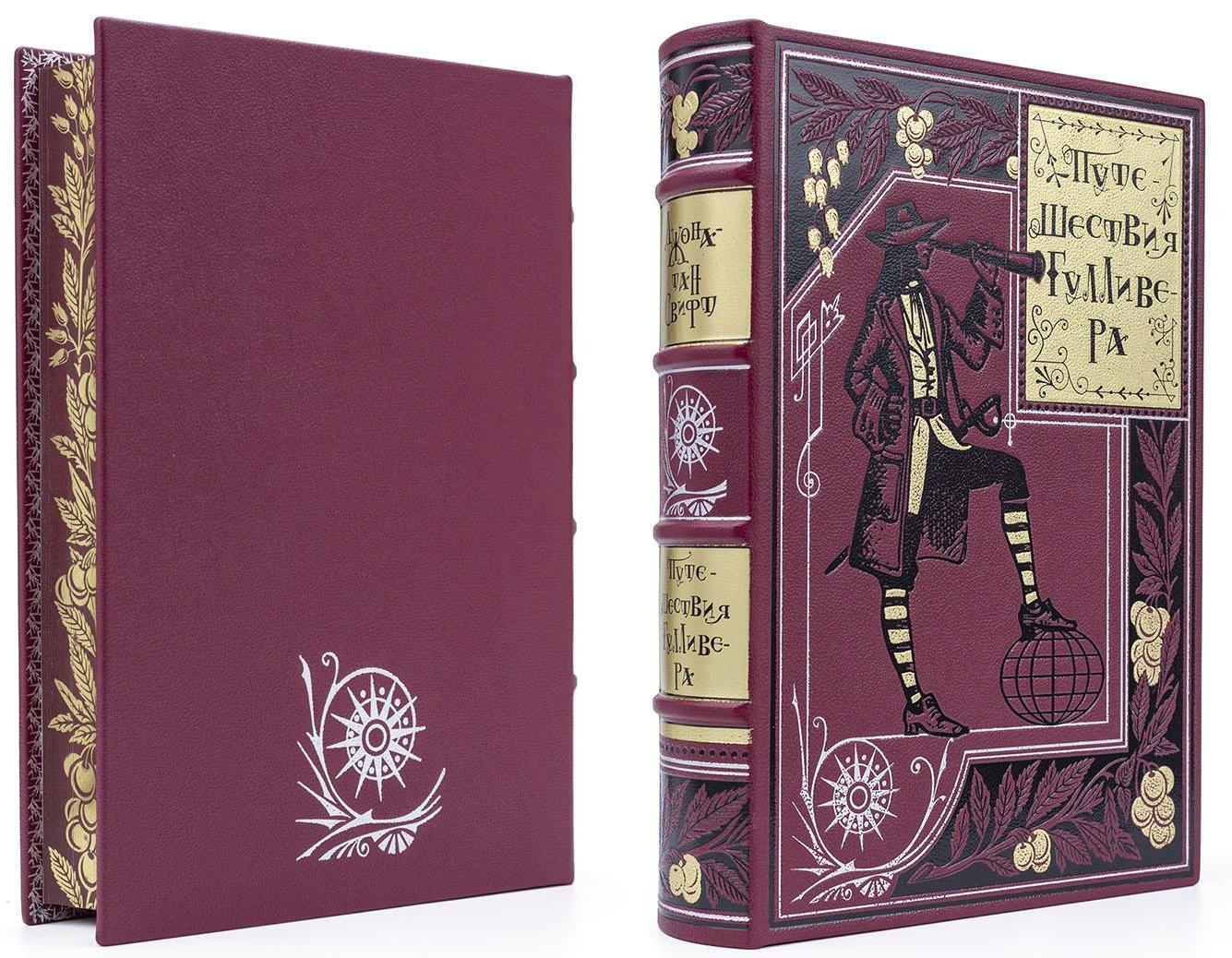 Путешествия Гулливера подарочное издание лучшего произведения Джонатана Свифта. Исторический стиль кожаного переплета, интересного, винного цвета переплетная кожа, тематическое тиснение: рельефное и цветное. Обрезы страниц тонированы и украшены орнаментом. Книги отпечатаны на итальянской бумаге!