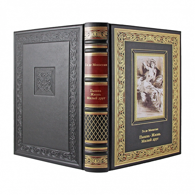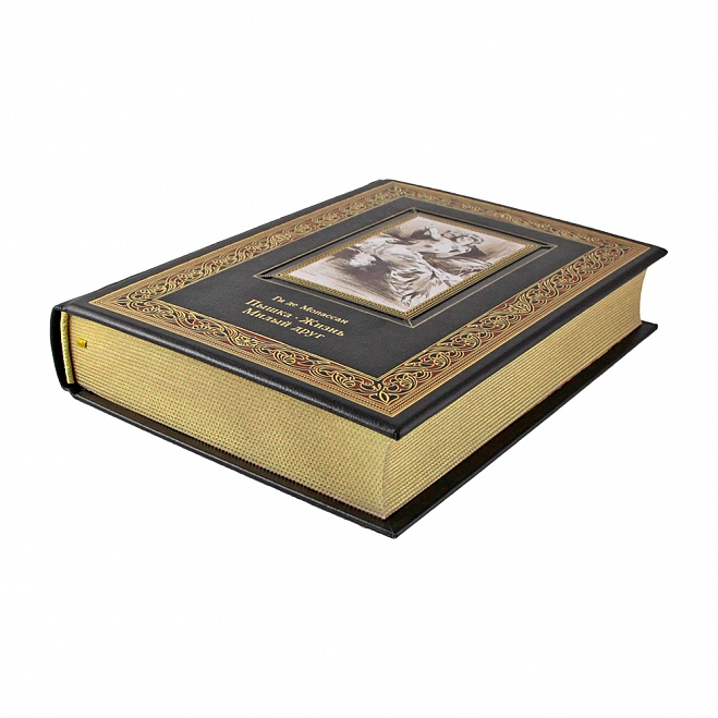 Подарочная книга "Пышка. Жизнь. Милый друг" Ги де Мопассан АННОТАЦИЯ В сборник вошли новелла «Пышка» (1880) в переводе Алексея Николаевича Маслова (литературный псевдоним А. Бeжецкий) (1852–1922) и романы «Жизнь» (1883) в переводе Александры Николаевны Чеботаревской (1870–1925) и «Милый друг» (1885) в переводе Анастасии Николаевны Чеботаревской (1877–1921). Книга проиллюстрирована рисунками французских художников Пьера Жоржа Жаннио (1848–1934), Жюля Мари Огюста Леру (1871–1954) и Фердинанда Бака (1859–1952). ОПИСАНИЕ Классический европейский переплёт ручной работы из натуральной кожи. Форзац из дизайнерской бумаги Malmero с тиснением орнамента золотой фольгой. 6 бинтов на корешке, ручной обработки. Каптал золотой из натуральной кожи. Обрез блока - золото с торшонированием. Тиснение блинтовое, золотой и цветной фольгой. Ляссе. Инкрустация кожаной вставкой с полноцветной печатью. Вес 1110г