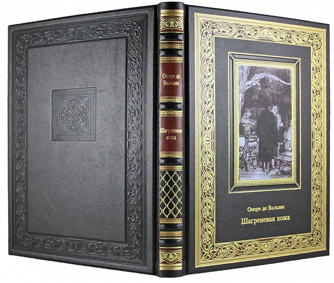 Подарочная книга "Шагреневая кожа" Оноре де Бальзак АННОТАЦИЯ «Шагреневая кожа» — еще один роман из «Сцен жизни Парижа» большого цикла «Человеческая комедия», написанный О. де Бальзаком в 1830-1831гг. Автор рисует картину жизни простого человека, чья судьба переплелась с древним мистическим талисманом таинственного Востока. Иллюстрации к роману создал французский художник XIX в. Шарль Уард. Его работы подчеркивают социальную направленность произведения. ОПИСАНИЕ Классический европейский переплёт ручной работы из натуральной кожи. Форзац из дизайнерской бумаги Malmero с тиснением орнамента золотой фольгой. 6 бинтов на корешке, ручной обработки. Каптал золотой из натуральной кожи. Обрез блока - золото с торшонированием. Тиснение блинтовое, золотой и цветной фольгой. Ляссе. Инкрустация кожаной вставкой с полноцветной печатью. Вес 530г
