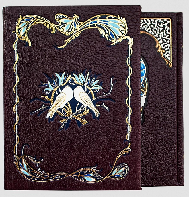 Напечатано в Словении лимитированным тиражом на элитной бумаге G-print. Книги переплетены в кожу Maroken (Франция) и помещены в уникальный по сложности выполнения кожаный футляр ручной работы с тиснением фольгой на всех сторонках футляра. Необычный переплет с тиснением 9-ю различными цветами фольги,оригинальные заставки, изящные уголки и рамки и трехсторонний золотой обрез создают потрясающе изысканное обрамление издания, способного заинтересовать самого придирчивого ценителя прекрасного.