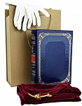"Богато оформленное собрание, представлено в подарочном издании. Цельнокожаный переплёт из натуральной шагрени, ручной работы, украшен цветной кожаной вставкой, а также серебряным