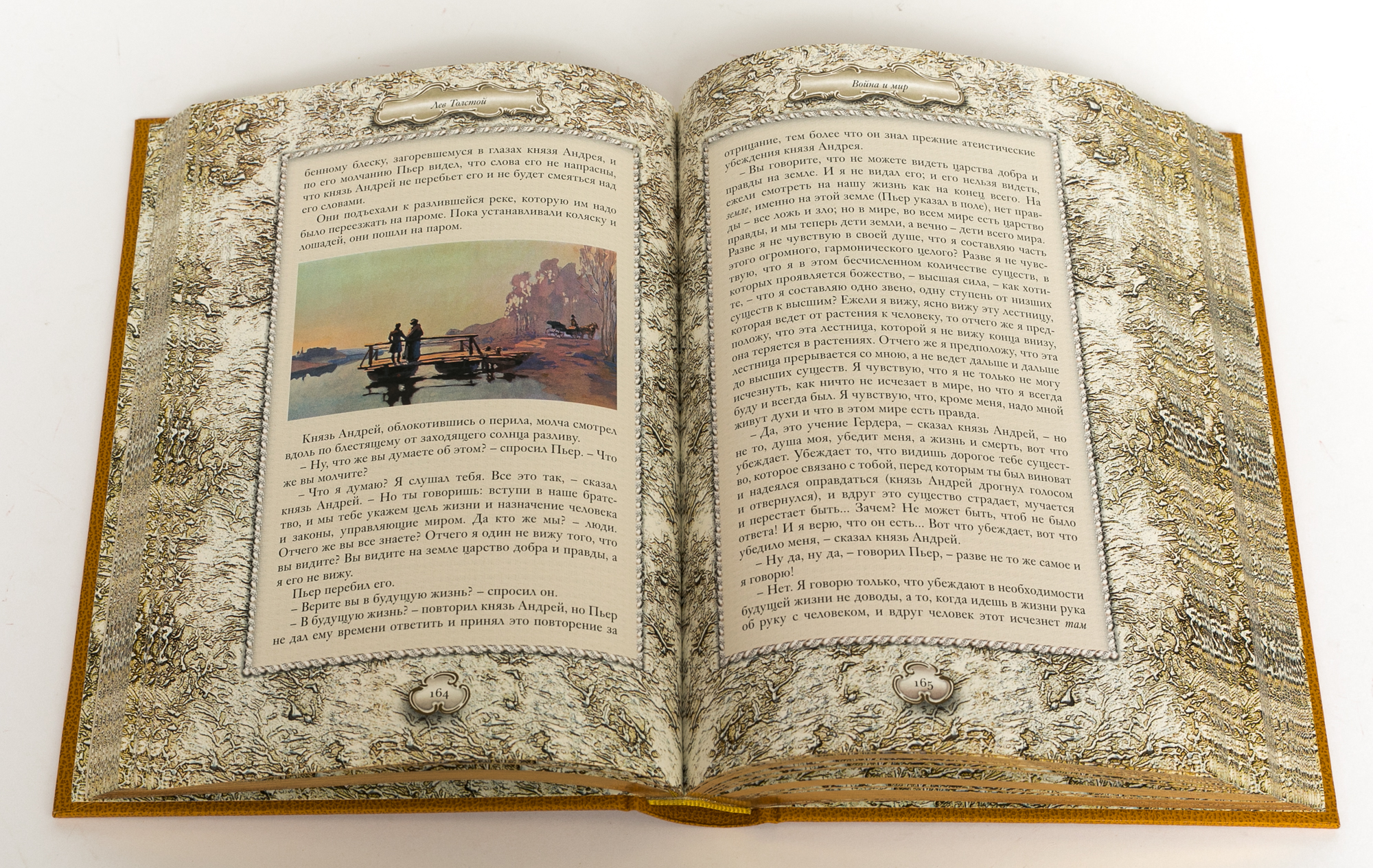 Подарочная книга «Война и мир» Л.Толстой (в 4 томах) ОПИСАНИЕ Издательство "Интрейд Корпорейшн" адресует вам, уважаемые книголюбы, лучшее в истории книгопечатания собрание сочинений графа Льва Николаевича Толстого. В художественном оформлении издания использованы иллюстрации ведущих российских и французских художников: В.Серова, А.Николаева, И.Архипова, К.Верне, А.Гро, Э.Детайля, Ф.Константа. Огромное количество иллюстраций, собранных впервые, многие из которых неизвестны читателям, позволяет подчеркнуть эпический характер произведения, наглядно продемонстрировать важнейшие исторические события того времени в видении как российских, так и французских художников, показать звездный час и падение Наполеона — этого символа войны, столь нелюбимого Толстым. Внешнее и внутреннее оформление книг не имеет себе равных из всех собраний великого мастера, когда — либо издававшихся не только в России, но и за рубежом. Сочетание трехстороннего золотого обреза с семицветным тиснением фольги на двух сторонках обложки и корешке придает изданию изысканный и роскошный вид.