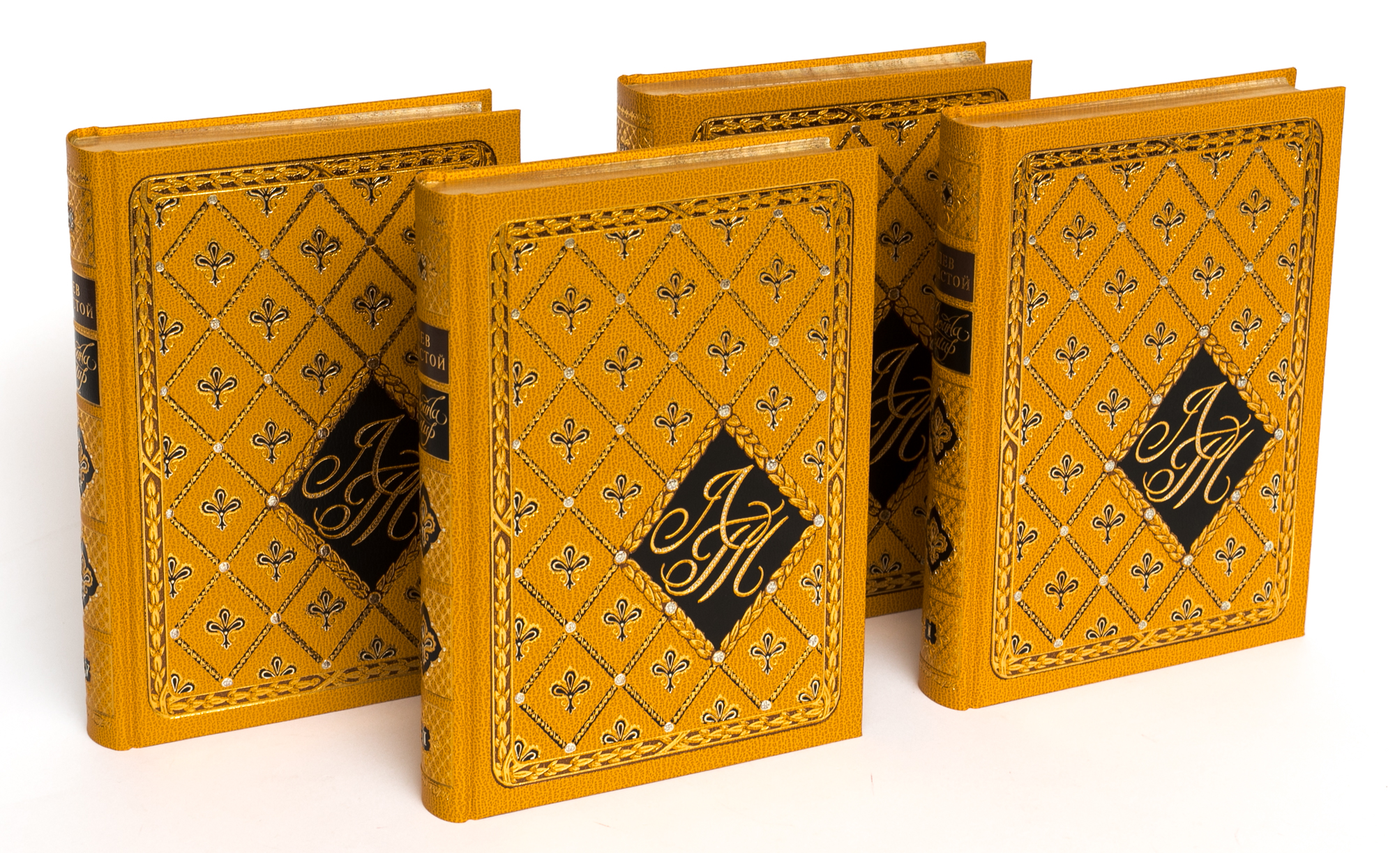 Издательство "Интрейд Корпорейшн" адресует вам, уважаемые книголюбы, лучшее в истории книгопечатания собрание сочинений графа Льва Николаевича Толстого. В художественном оформлении издания использованы иллюстрации ведущих российских и французских художников: В.Серова, А.Николаева, И.Архипова, К.Верне, А.Гро, Э.Детайля, Ф.Константа. Огромное количество иллюстраций, собранных впервые, многие из которых неизвестны читателям, позволяет подчеркнуть эпический характер произведения, наглядно продемонстрировать важнейшие исторические события того времени в видении как российских, так и французских художников, показать звездный час и падение Наполеона — этого символа войны, столь нелюбимого Толстым. Внешнее и внутреннее оформление книг не имеет себе равных из всех собраний великого мастера, когда — либо издававшихся не только в России, но и за рубежом. Сочетание трехстороннего золотого обреза с семицветным тиснением фольги на двух сторонках обложки и корешке придает изданию изысканный и роскошный вид.