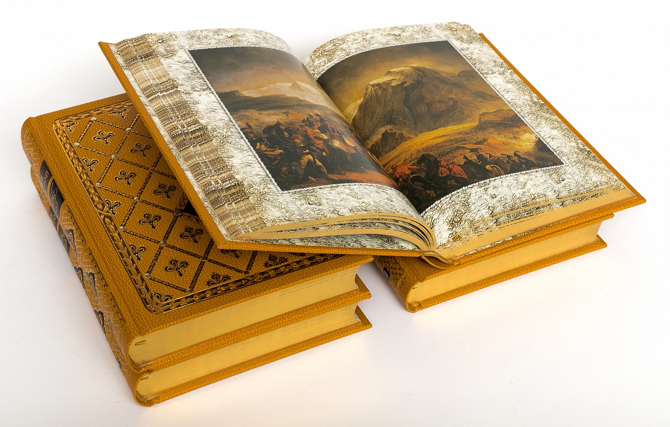 Подарочная книга «Война и мир» Л.Толстой (в 4 томах) ОПИСАНИЕ Издательство "Интрейд Корпорейшн" адресует вам, уважаемые книголюбы, лучшее в истории книгопечатания собрание сочинений графа Льва Николаевича Толстого. В художественном оформлении издания использованы иллюстрации ведущих российских и французских художников: В.Серова, А.Николаева, И.Архипова, К.Верне, А.Гро, Э.Детайля, Ф.Константа. Огромное количество иллюстраций, собранных впервые, многие из которых неизвестны читателям, позволяет подчеркнуть эпический характер произведения, наглядно продемонстрировать важнейшие исторические события того времени в видении как российских, так и французских художников, показать звездный час и падение Наполеона — этого символа войны, столь нелюбимого Толстым. Внешнее и внутреннее оформление книг не имеет себе равных из всех собраний великого мастера, когда — либо издававшихся не только в России, но и за рубежом. Сочетание трехстороннего золотого обреза с семицветным тиснением фольги на двух сторонках обложки и корешке придает изданию изысканный и роскошный вид.