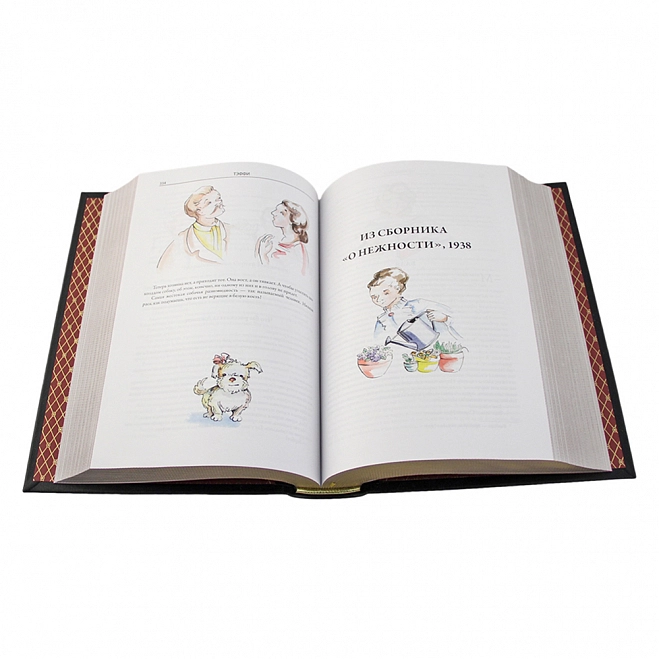 Подарочная книга "Юмористические рассказы" Тэффи АННОТАЦИЯ Сборник включает лучшие юмористические рассказы Надежды Александровны Лохвицкой, вошедшей в литературу под своим псевдонимом Тэффи. Искрометными фельетонами и юморесками этой писательницы, которую называли «сатириком в юбке» и «королевой русского юмора», зачитывалась в начале XX века вся страна. В сборник входят свыше пятидесяти повестей и рассказов, публиковавшихся в эмигрантской газете «Возрождение» с 1927 по 1936 годы, и с тех пор ни разу не переиздававшихся. Сборник проиллюстрировала современная художница Светлана Носовская. ОПИСАНИЕ Классический европейский переплёт ручной работы из натуральной кожи. Форзац из дизайнерской бумаги Malmero с тиснением орнамента золотой фольгой. 6 бинтов на корешке, ручной обработки. Каптал золотой из натуральной кожи. Обрез блока - золото с торшонированием. Тиснение блинтовое, золотой и цветной фольгой. Ляссе. Инкрустация кожаной вставкой с полноцветной печатью. Вес 1860г