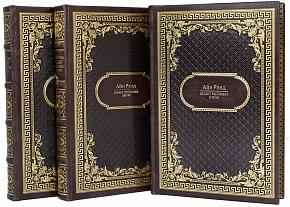 Богато оформленное собрание, представлено в подарочном издании. Цельнокожаный переплёт ручной работы, украшен золотым иблинтовым тиснением. Корешок декорирован бинтами. Текст книг напечатан на офсетной бумаге. Обрез оформлен художественным изображением. Ляссе из шёлковой ленты. Форзац цельный из дизайнерской бумаги.Дублюра окатана золотом.