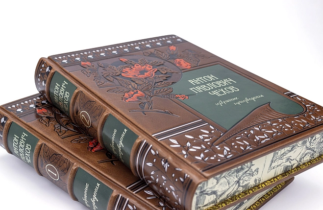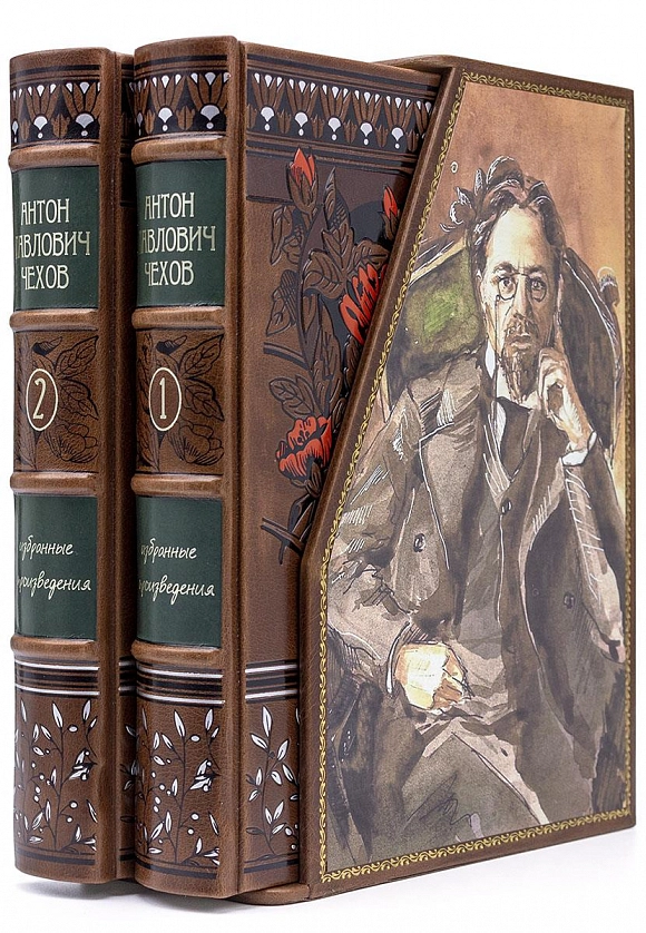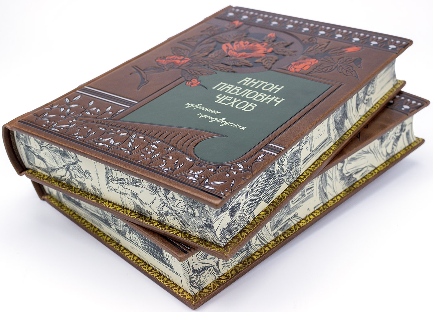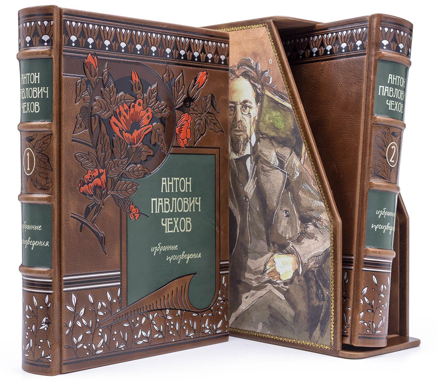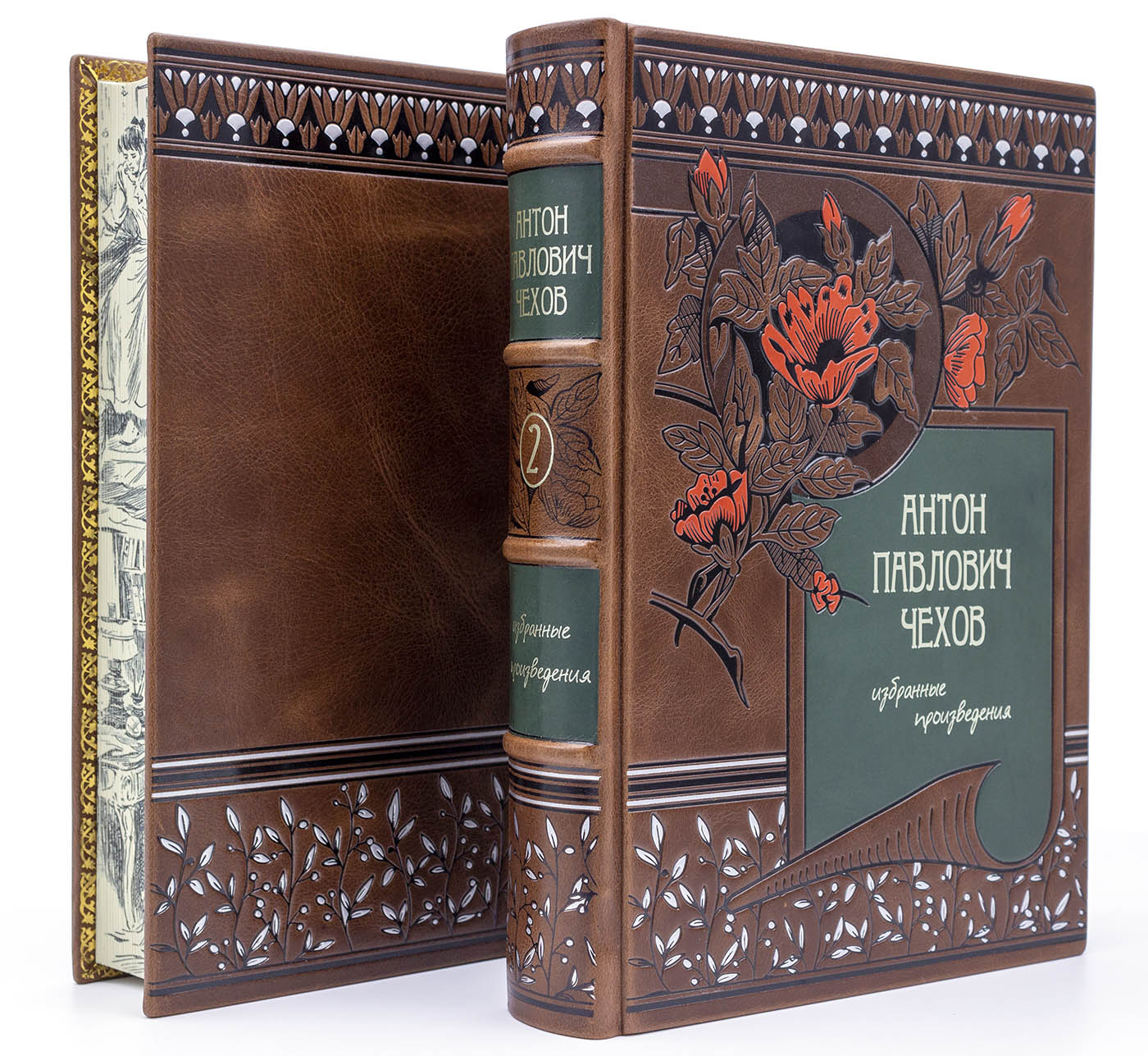Подарочные книги в кожаном переплёте. Антон Павлович Чехов избранное. Повести и рассказы, пьесы Чайка, Три сестры, Вишневый сад в подарочном издании, художественный кожаный переплет.