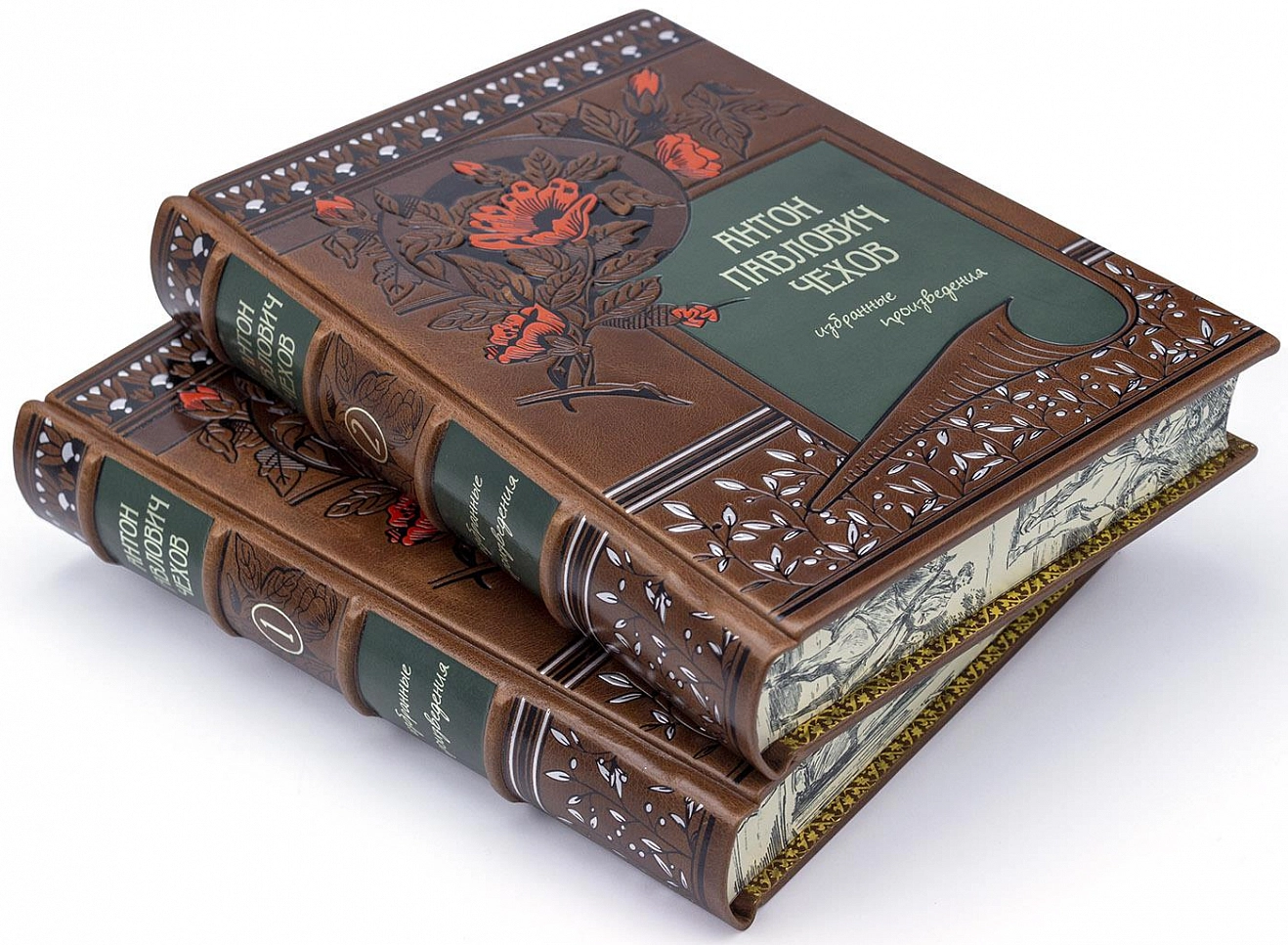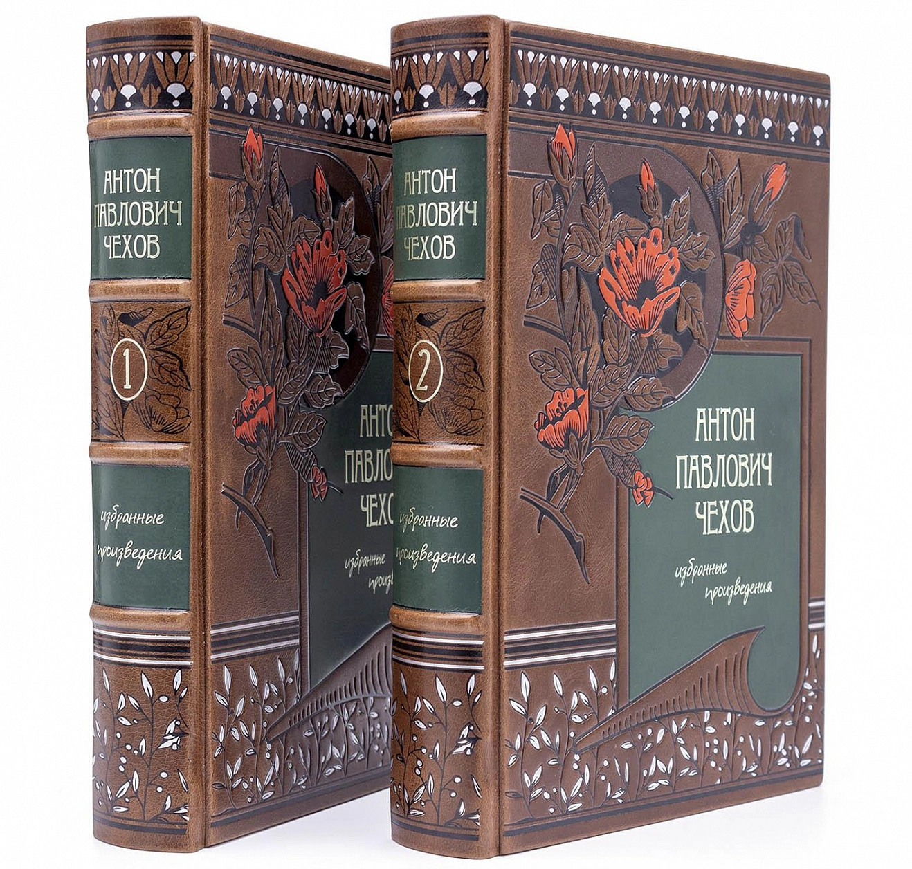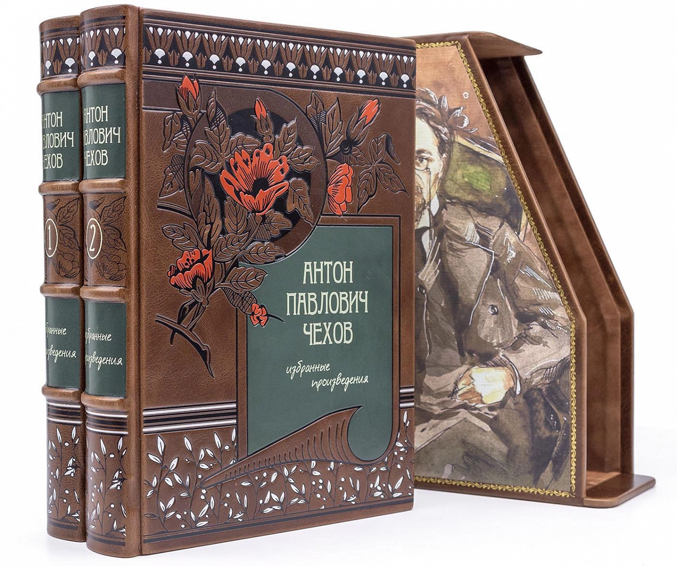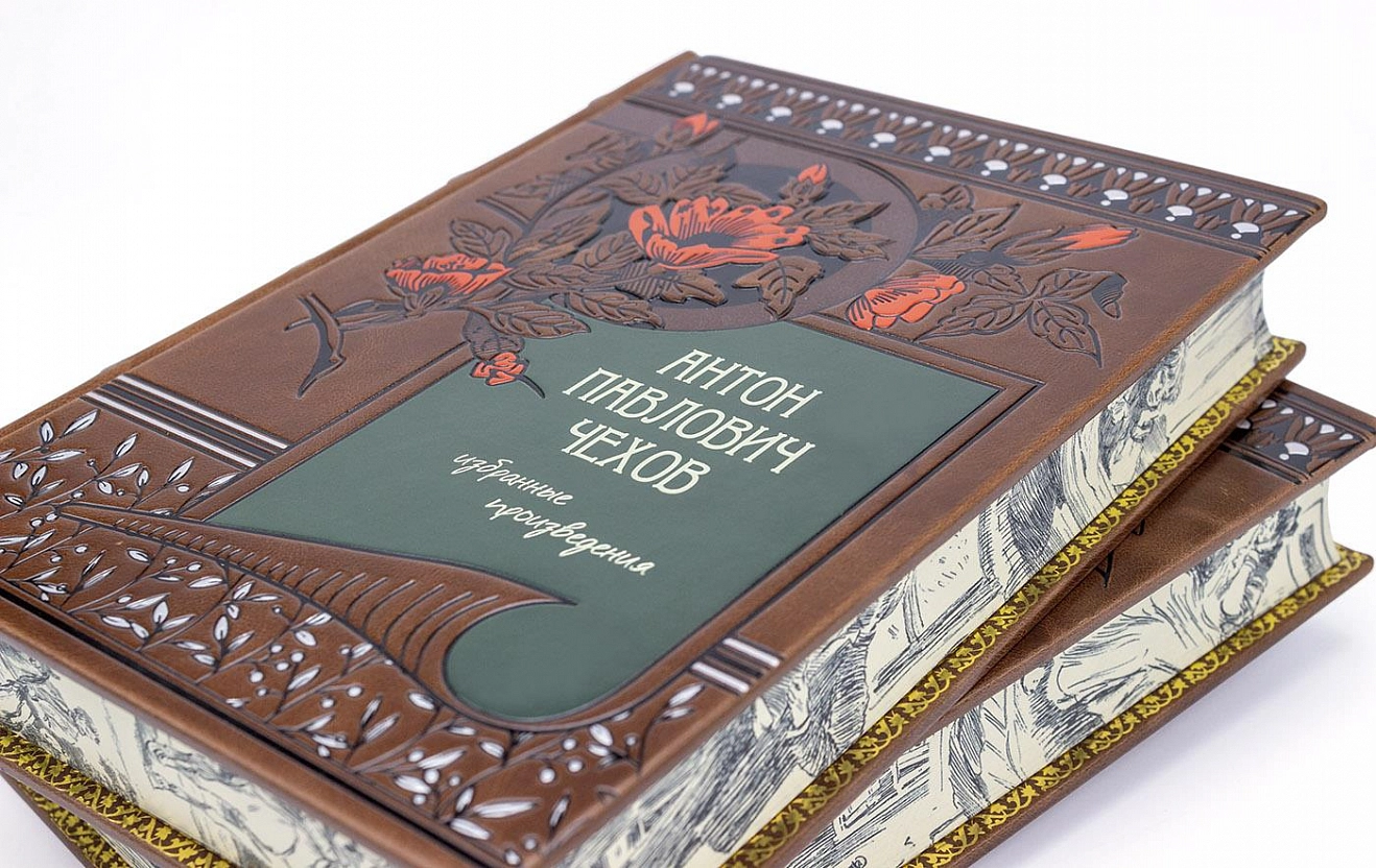 Подарочные книги в кожаном переплёте. Антон Павлович Чехов избранное. Повести и рассказы, пьесы Чайка, Три сестры, Вишневый сад в подарочном издании, художественный кожаный переплет.