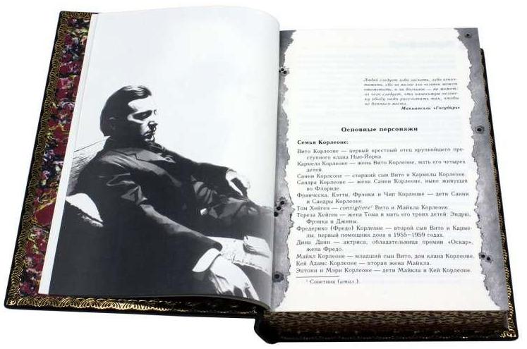 \Подарочное издание Кожаный переплет в историческом французском стиле в 4 томах. В биографии Крёстного отца воплотилась «история американской мафии»: Вито Корлеоне, как и реальные лидеры организованной преступности Костелло, Дженовезе, Лаки Лучано, начинал строительство своего клана с участия в уличных группах; затем основал легальный бизнес, под прикрытием которого осуществлялась масштабная криминальная деятельность. Архивы полиции использовались автором «Крёстного отца» в качестве рабочих материалов, это помогало насытить роман необходимыми подробностям, также «художественная убедительность» романа связана с хорошим знанием темы: детство Пьюзо прошло в итальянских кварталах Нью-Йорка.