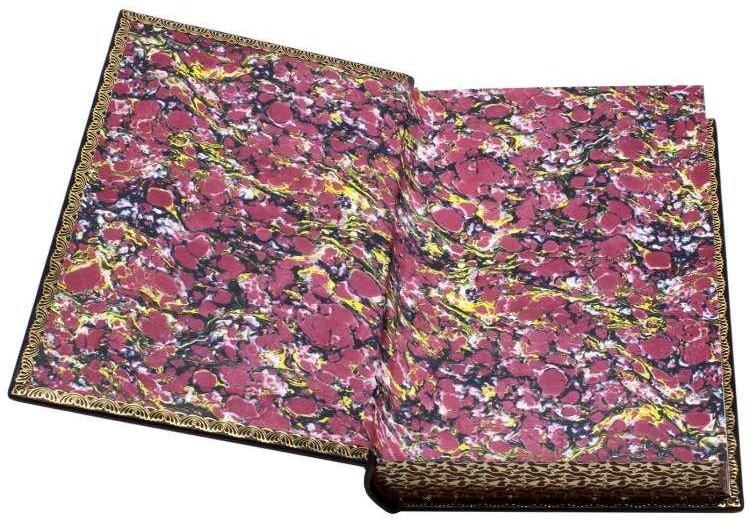 Серия книг в кожаном французском стиле переплета, тиснение по коже блинтовое, рельефное и цветное. Книжные блоки тонированы с нанесением орнамента на обрезы с трех сторон. Специально для этих разработан дизайн страниц. Книга отпечатана на немецкой бумаге Ozon Ivory. Это ручная работа и ограниченный тираж!