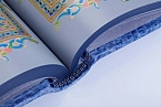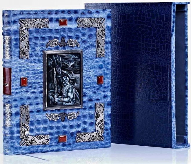 Сага о Греттире. Экземпляр № 13 КВЧ.08.018 АННОТАЦИЯ Одна из самых увлекательных скандинавских саг в особенном оформлении. Каждая страница украшена цветными скандинавскими орнаментами (печать в четыре краски). Специально созданные для этого издания иллюстрации, отражающие дух суровой эпохи викингов, вклеены вручную. Это издание буквально напоено мощной энергетикой севера благодаря полной гармонии содержания и оформления. Печать в 4 краски, печать золотой пастой, печать серебряной пастой. ОПИСАНИЕ Французский цельнокожаный переплет ручной работы на трех шнурах. Кожа «крокодил», цвет - синий (фирма «Винтер», Англия). Форзац раздельный на кожаной слизуре. Каптал шелковый ручного плетения. Тиснение серебряной фольгой. Обрез окрашенный и полированный. Ювелирные украшения переплета - серебро 925 пробы, вес 597 граммов, чернение. Сердолик сычуаньский (Китай) - 4 камня, огранка «кабошон». Лаковая роспись (Федоскино).