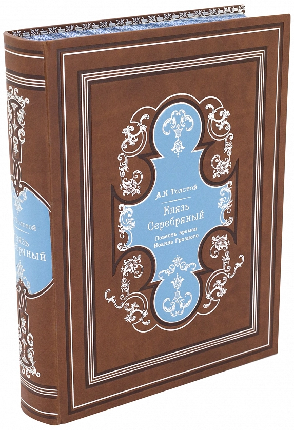 Подарочная книга «Князь Серебряный. Повесть времён Ивана Грозного» Толстой А.К. АННОТАЦИЯ Литературно-художественное издание. Коллекционная. Тираж 50 номерных экземпляров. Москва. 2019. Представляем читателям великолепное библиофильское издание «Князя Серебряного», проиллюстрированное художником Ю.В. Ивановым. ОФОРМЛЕНИЕ Книга исполнена по старинной французской технологии; Переплет цельнокожаный; Художественное двухцветное тиснение на обложке и корешке; вставки из кожи голубого цвета. Бумага дизайнерская, кремовая (Франция); Блок сшит на пяти шнурах; Форзац выполнен из мраморной бумаги ручного крашения; Дублюра окатана вручную серебром; Обрез блока с художественным оформлением: окрашен и гравирован вручную; Ляссе шелковое, каптал ручного плетения; Индивидуальный футляр.