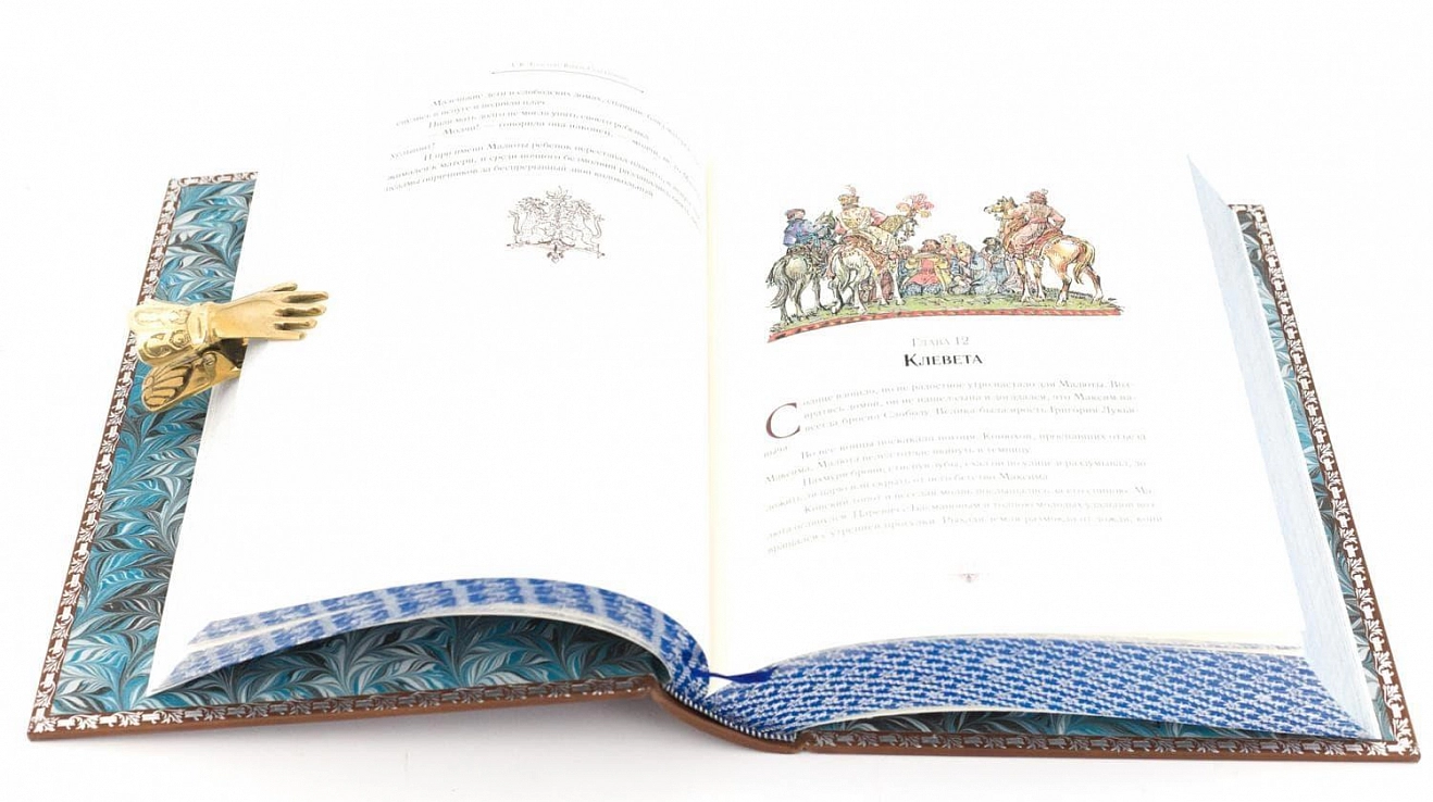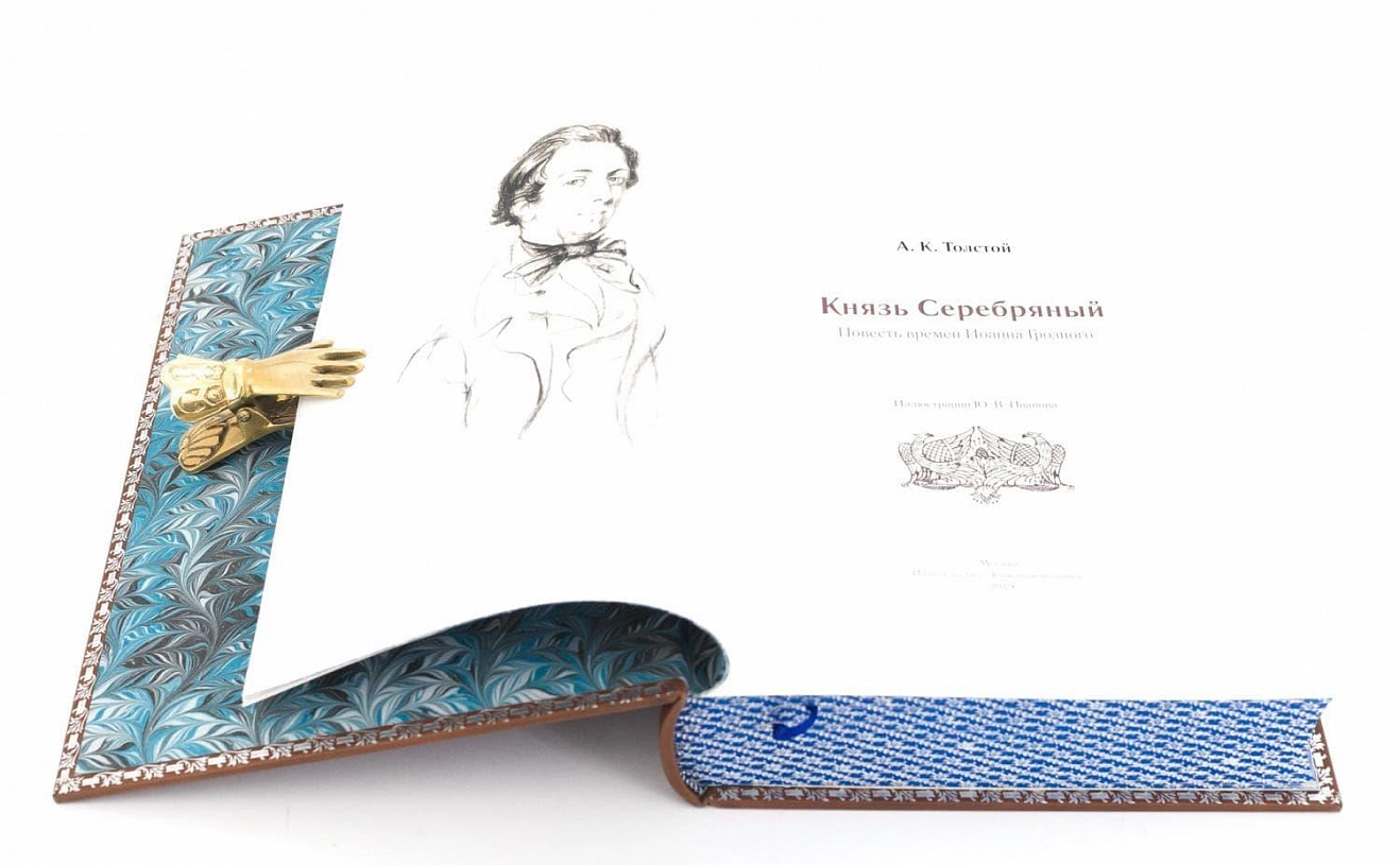 Подарочная книга «Князь Серебряный. Повесть времён Ивана Грозного» Толстой А.К. АННОТАЦИЯ Литературно-художественное издание. Коллекционная. Тираж 50 номерных экземпляров. Москва. 2019. Представляем читателям великолепное библиофильское издание «Князя Серебряного», проиллюстрированное художником Ю.В. Ивановым. ОФОРМЛЕНИЕ Книга исполнена по старинной французской технологии; Переплет цельнокожаный; Художественное двухцветное тиснение на обложке и корешке; вставки из кожи голубого цвета. Бумага дизайнерская, кремовая (Франция); Блок сшит на пяти шнурах; Форзац выполнен из мраморной бумаги ручного крашения; Дублюра окатана вручную серебром; Обрез блока с художественным оформлением: окрашен и гравирован вручную; Ляссе шелковое, каптал ручного плетения; Индивидуальный футляр.