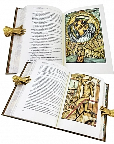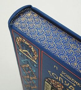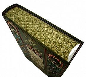 Украшение переплета: инкрустация на обложке и корешке; тиснение цветной фольгой; обрез блока окрашен и гравирован вручную;