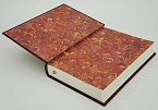 Украшение переплета: инкрустация на обложке и корешке; тиснение цветной фольгой; обрез блока окрашен и гравирован вручную; форзац из бумаги ручного крашения; ручная накатка орнамента дублюры, каптал ручного плетения;