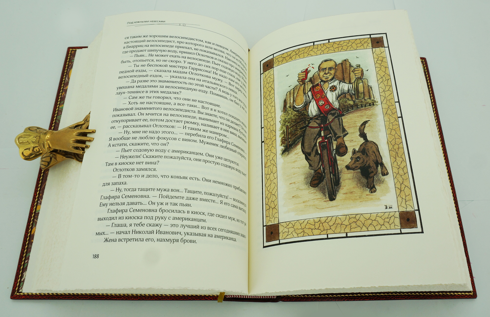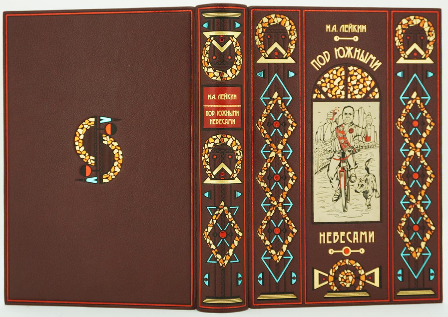 ЛЕЙКИН Н.А. «ПОД ЮЖНЫМИ НЕБЕСАМИ» (ЮМОРИСТИЧЕСКОЕ ОПИСАНИЕ ПУТЕШЕСТВИЯ СУПРУГОВ НИКОЛАЯ ИВАНОВИЧА И ГЛАФИРЫ СЕМЁНОВНЫ ИВАНОВЫХ В БИАРРИЦ И МАДРИД) АННОТАЦИЯ Коллекционное издание (100 пронумерованных экземпляров). Москва. 2020 год. Творчество Николая Александровича Лейкина, видного русского юмориста, издателя журнала «Осколки», писателя, которого Чехов называл своим литературным «крестным батькой» ,сегодня незаслуженно забыто. Между тем в литературной среде чеховской эпохи Лейкину по праву принадлежало одно из важных мест. [Его произведения молодой Чехов, по собственному признанию, читал «ревностно» и «захлебываясь» от удовольствия]. Автор многих книг, в том числе известнейшей «Наши за границей» (1890) — сатирического описания путешествия по Европе купеческой пары из Петербурга, которая выдержала 24 прижизненных переиздания; всего до революции 1917 года — 27 переизданий. В советское время произведения Лейкина практически не переиздавались. Прекрасные авторские иллюстрации в стиле Ар-деко были созданы художником-графиком Д. Шинбиным. Обложка оформлена в стиле Ар-деко и сама по себе является непревзойденным образцом современного переплетного искусства. Великолепно оформленное издание украсит любую библиотеку, и будет хорошим подарком для знатоков и ценителей книги. ОФОРМЛЕНИЕ Кожа натуральная (шагрень, Франция); Бумага дизайнерская, «Olin» (Франция); Переплет цельнокожаный, выполнен по классической старинной технологии (французский переплет); Блок сшит на 4-х шнурах. Украшение переплета: инкрустация на обложке и корешке; тиснение цветной фольгой; обрез блока окрашен и гравирован вручную; форзац из бумаги ручного крашения; ручная накатка орнамента дублюры, каптал ручного плетения; Индивидуальный футляр с кожаной окатовкой.