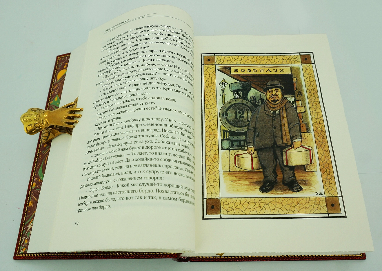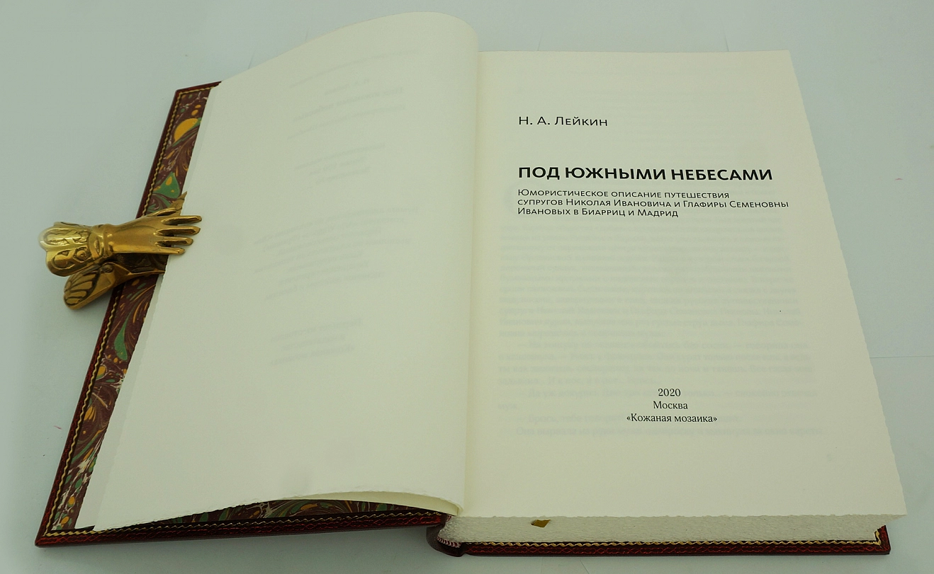 ЛЕЙКИН Н.А. «ПОД ЮЖНЫМИ НЕБЕСАМИ» (ЮМОРИСТИЧЕСКОЕ ОПИСАНИЕ ПУТЕШЕСТВИЯ СУПРУГОВ НИКОЛАЯ ИВАНОВИЧА И ГЛАФИРЫ СЕМЁНОВНЫ ИВАНОВЫХ В БИАРРИЦ И МАДРИД) АННОТАЦИЯ Коллекционное издание (100 пронумерованных экземпляров). Москва. 2020 год. Творчество Николая Александровича Лейкина, видного русского юмориста, издателя журнала «Осколки», писателя, которого Чехов называл своим литературным «крестным батькой» ,сегодня незаслуженно забыто. Между тем в литературной среде чеховской эпохи Лейкину по праву принадлежало одно из важных мест. [Его произведения молодой Чехов, по собственному признанию, читал «ревностно» и «захлебываясь» от удовольствия]. Автор многих книг, в том числе известнейшей «Наши за границей» (1890) — сатирического описания путешествия по Европе купеческой пары из Петербурга, которая выдержала 24 прижизненных переиздания; всего до революции 1917 года — 27 переизданий. В советское время произведения Лейкина практически не переиздавались. Прекрасные авторские иллюстрации в стиле Ар-деко были созданы художником-графиком Д. Шинбиным. Обложка оформлена в стиле Ар-деко и сама по себе является непревзойденным образцом современного переплетного искусства. Великолепно оформленное издание украсит любую библиотеку, и будет хорошим подарком для знатоков и ценителей книги. ОФОРМЛЕНИЕ Кожа натуральная (шагрень, Франция); Бумага дизайнерская, «Olin» (Франция); Переплет цельнокожаный, выполнен по классической старинной технологии (французский переплет); Блок сшит на 4-х шнурах. Украшение переплета: инкрустация на обложке и корешке; тиснение цветной фольгой; обрез блока окрашен и гравирован вручную; форзац из бумаги ручного крашения; ручная накатка орнамента дублюры, каптал ручного плетения; Индивидуальный футляр с кожаной окатовкой.