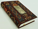 Украшение переплета: инкрустация на обложке и корешке; тиснение цветной фольгой; обрез блока окрашен и гравирован вручную; форзац из бумаги ручного крашения; ручная накатка орнамента дублюры, каптал ручного плетения;