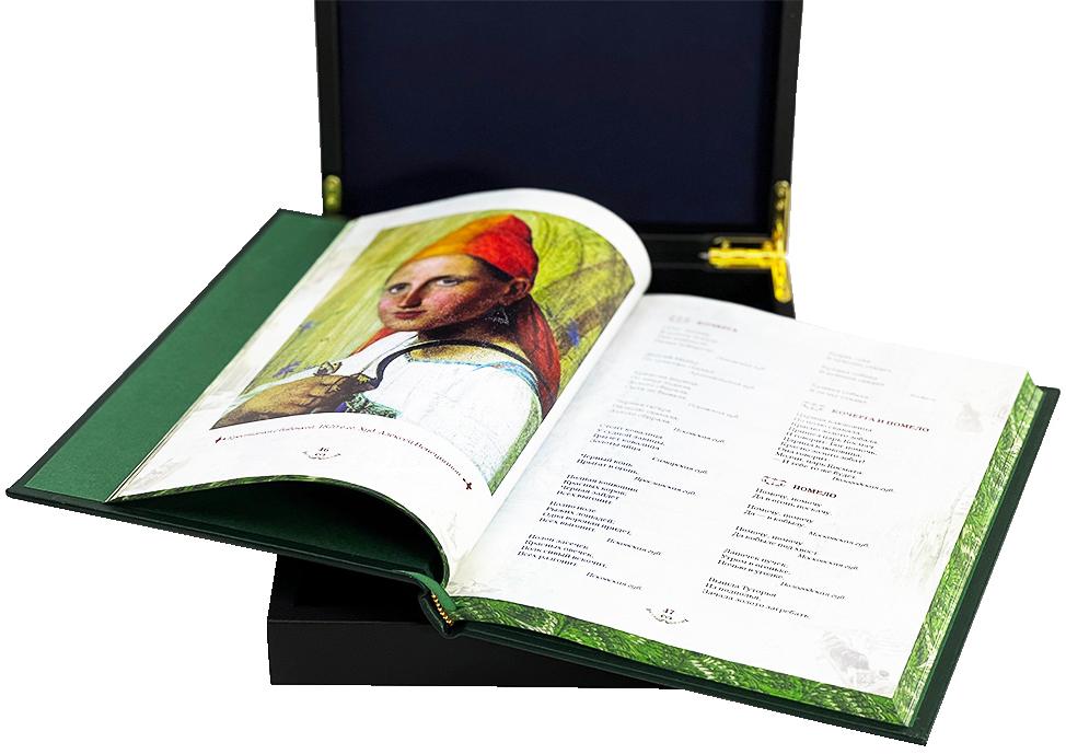 Издание представлено в оригинальной подарочной коробке. Дизайн прекрасно сочетает в себе золотое и блинтовое тиснение, художественную металлическую вставку, соответствующую тематике издания, а также крашенный в тон переплетного материала обрез. Цельнокожаный переплет ручной работы. Высококачественная бумага, красочные иллюстрации, ляссе.