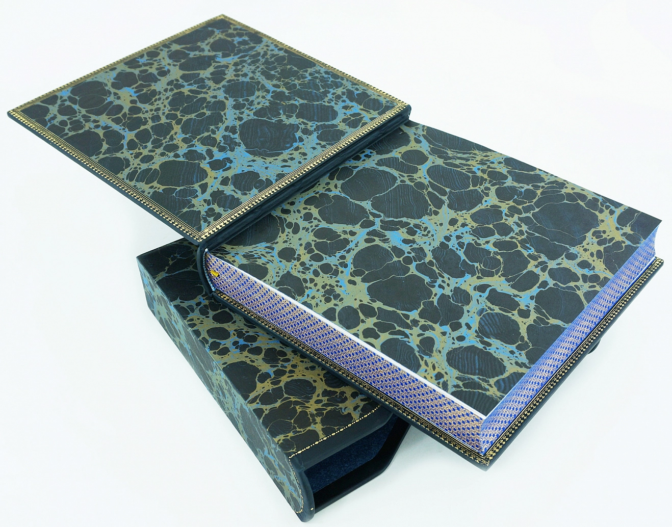 Блок сшит вручную, на шнуры (французский переплет), обрезы окрашены и гравированы вручную. Форзац из мраморной бумаги ручного крашения; по периметру накатан бордюрный орнамент. Переплет выполнен из натуральной, застаренной кожи, с художественным, фантазийным тиснением, в т.ч. ручным. Для книги изготовлен фигурный футляр с кожаной окантовкой. Эксклюзивное исполнение переплета.