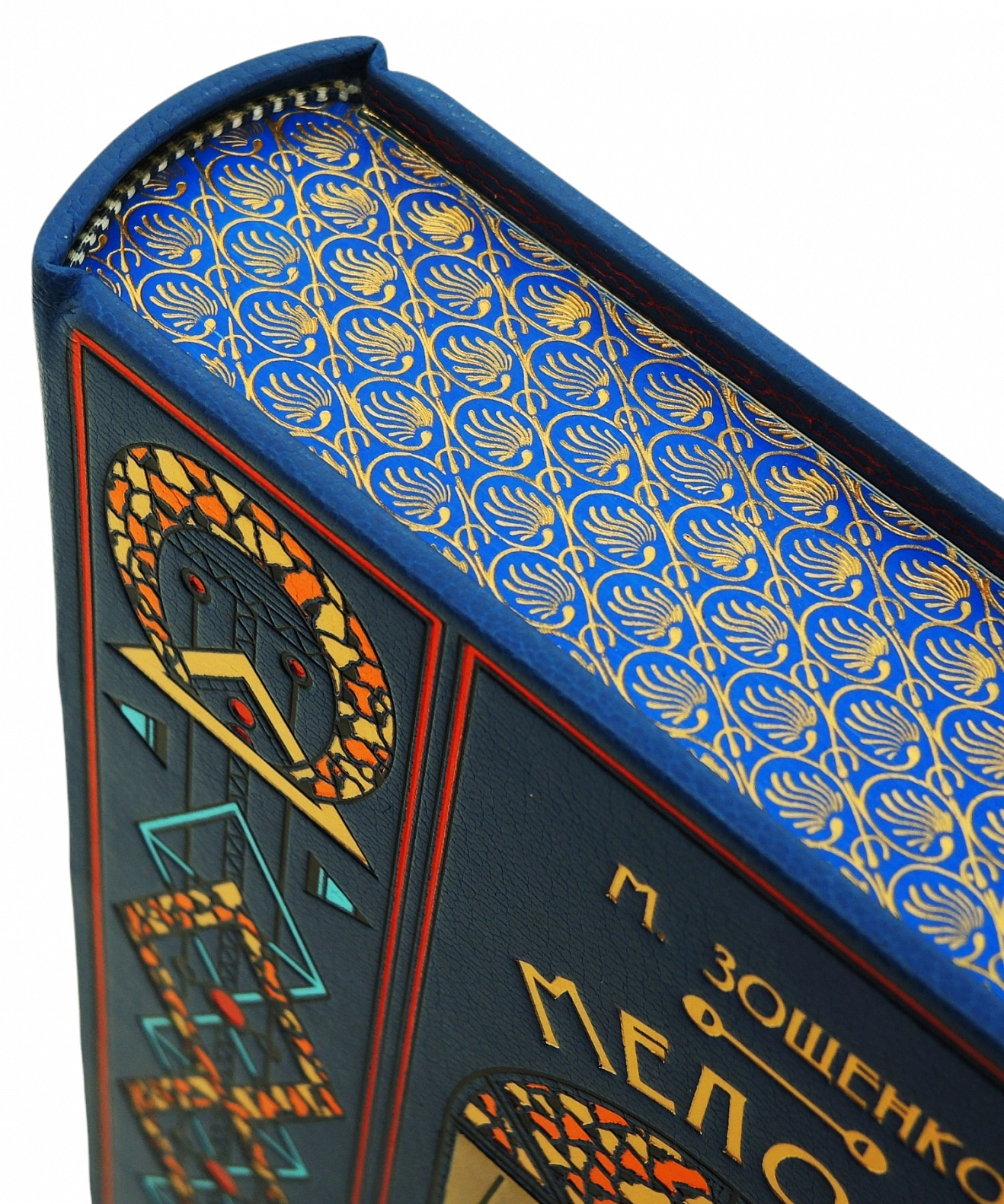 Подарочная книга «Мелочи жизни» М.Зощенко АННОТАЦИЯ Коллекционное издание (100 пронумерованных экземпляров). Москва. 2018 год. Представляем вашему вниманию сборник рассказов «Голубая книга». Прекрасные авторские иллюстрации в стиле Ар деко были созданы художником-графиком Д. Шинбиным. Обложка оформлена в стиле Ар деко и сама по себе является непревзойденным образцом современного переплетного искусства. Великолепно оформленное издание украсит любую библиотеку, и будет хорошим подарком для знатоков и ценителей книги. ОФОРМЛЕНИЕ Кожа натуральная (шагрень, Франция); Бумага дизайнерская, «Olin» (Франция); Переплет цельнокожаный, выполнен по классической старинной технологии (французский переплет); Блок сшит на 4-х шнурах. Украшение переплета: инкрустация на обложке и корешке; тиснение цветной фольгой; обрез блока окрашен и гравирован вручную; форзац из бумаги ручного крашения; ручная накатка орнамента дублюры, каптал ручного плетения; индивидуальный футляр с кожаной окантовкой.