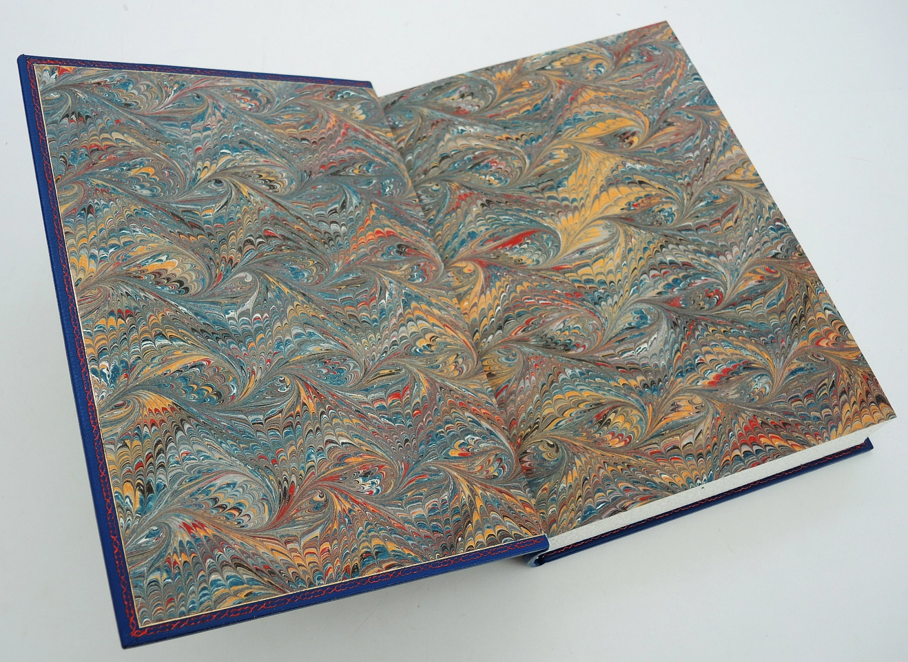 Украшение переплета: инкрустация на обложке и корешке; тиснение цветной фольгой; обрез блока окрашен и гравирован вручную; форзац из бумаги ручного крашения; ручная накатка орнамента дублюры, каптал ручного плетения; индивидуальный футляр с кожаной окантовкой.