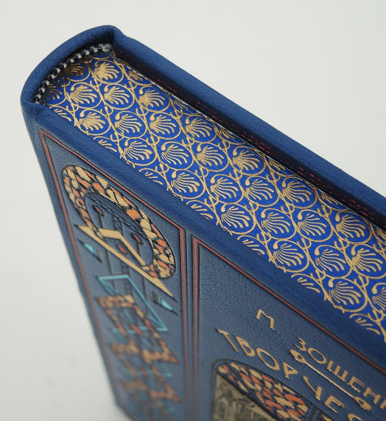 Подарочная книга «Творчество и действительность» М.Зощенко АННОТАЦИЯ Коллекционное издание (100 пронумерованных экземпляров). Москва. 2018 год. Представляем вашему вниманию сборник «Творчество и действительность». В книгу вошли известные и популярные комедии и фельетоны, такие как «Свадьба», «Суета сует», «Дефективные люди» и др. Прекрасные иллюстрации были созданы художником-графиком Д. Шинбиным. Обложка оформлена в стиле Ар-деко и сама по себе является непревзойденным образцом современного переплетного искусства. Великолепно оформленное издание украсит любую библиотеку, и будет хорошим подарком для знатоков и ценителей книги. ОФОРМЛЕНИЕ Кожа натуральная (шагрень, Франция); Бумага дизайнерская, «Olin» (Франция); Переплет цельнокожаный, выполнен по классической старинной технологии (французский переплет); Блок сшит на 4-х шнурах. Украшение переплета: инкрустация на обложке и корешке; тиснение цветной фольгой; обрез блока окрашен и гравирован вручную; форзац из бумаги ручного крашения; ручная накатка орнамента дублюры, каптал ручного плетения; индивидуальный футляр с кожаной окантовкой.