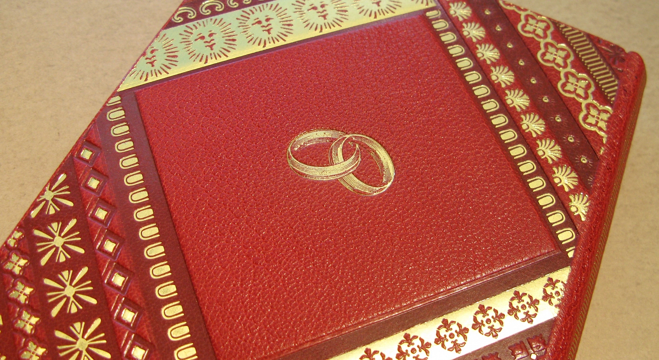 Крапленый обрез, окрашенная верхняя часть обреза с тиснением золотой фольгой