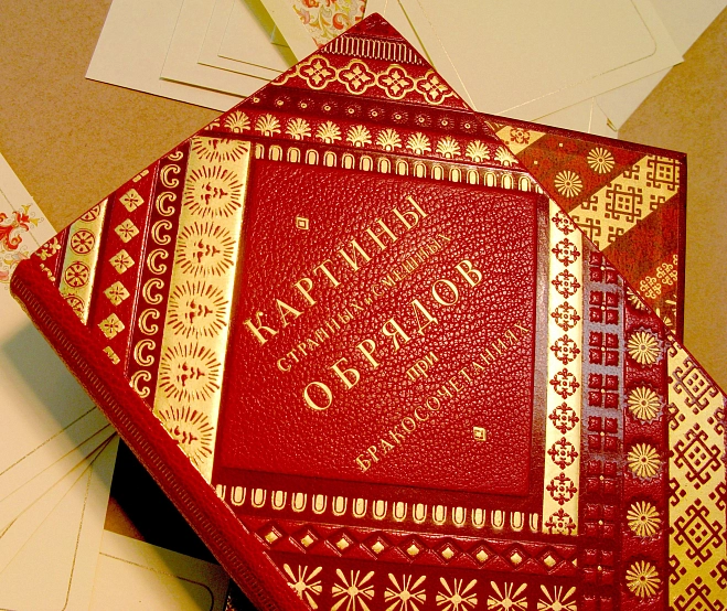 Подарочная книга "Картины странных и смешных обрядов при бракосочетаниях разных чужеземных и в России обитающих народов" Глеб Громов АННОТАЦИЯ Глеб Иванович Громов (1762–1830) — российский историограф брака, успешно совмещал государственную службу с литературной деятельностью, главной темой которой были отношения между мужчиной и женщиной. Одна из самых значимых его работ, «Картины странных и смешных обрядов при бракосочетаниях», увидела свет в Санкт-Петербурге в 1797 г., сразу стала библиографической редкостью и с тех пор не переиздавалась. Книга содержит свод описаний свадебных обычаев народов мира, почерпнутых составителем из российских и иностранных источников. Собранные автором сведения получили высокую оценку историков и не утратили актуальности и в наши дни. ОПИСАНИЕ Переплет ручной работы из натуральной кожи Футляр ручной работы: искусственная кожа, дизайнерская бумага Цветные иллюстрации Н. Власова Черно-белые иллюстрации Бумага Olin Regular (Франция) Крапленый обрез, окрашенная верхняя часть обреза с тиснением золотой фольгой