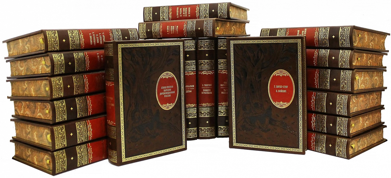 Богато оформленное собрание, представлено в подарочном издании. цельнокожаный переплёт ручной работы, украшен цветной кожаной вставкой,а также золотым и блинтовым тиснением. Корешок декорирован бинтами. Текст книг напечатан на офсетной бумаге. Обрез оформлен в технике "Перо павлина". Ляссе из шёлковой ленты. Форзац цельный из дизайнерской бумаги.Дублюра окатана золотом.