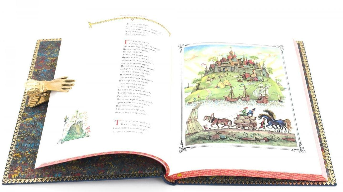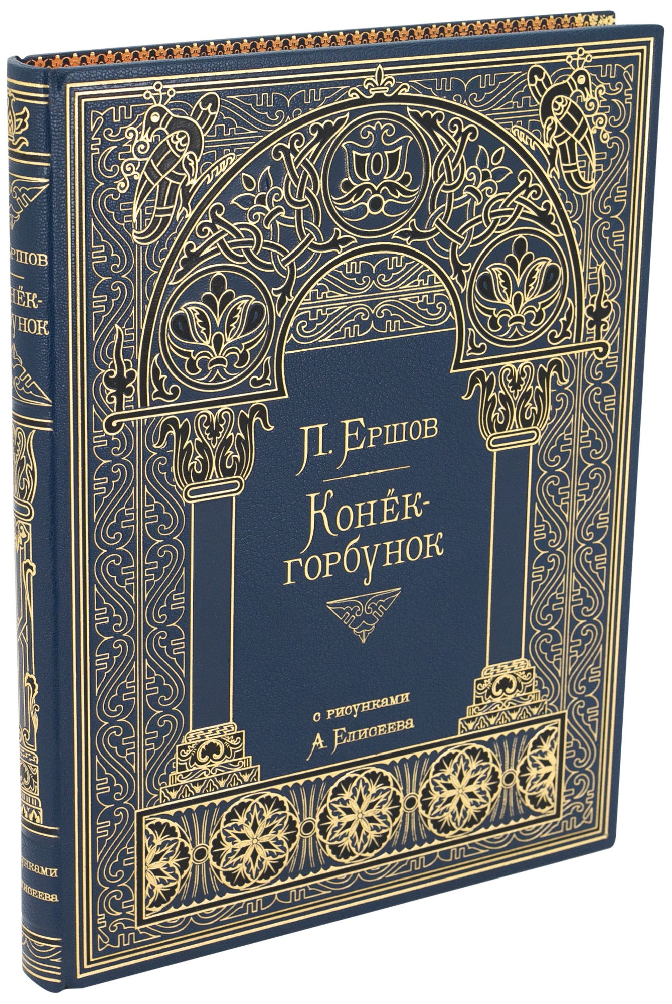 ЕРШОВ П. «КОНЁК – ГОРБУНОК» (РИС. А. ЕЛИСЕЕВА) АННОТАЦИЯ Коллекционное издание. Эксклюзивное исполнение. Тираж 100 номерных экземпляров. Москва. 2019. Специально для этого издания были приобретены права на использование рисунков Народного художника Российской Федерации Анатолия Елисеева. Печать в точности соответствует оригиналам иллюстраций. ОФОРМЛЕНИЕ Книга исполнена по старинной французской технологии; Переплет цельнокожаный, из натуральной шагрени (Франция); Бумага дизайнерская из коллекции «Olin», (Франция) Блок сшит на пяти шнурах; Переплетная крышка декорирована художественным многоцветным тиснением в стиле русского модерна; Форзац выполнен из мраморной бумаги ручного крашения; Дублюра окатана вручную 23-каратным золотом; Обрез блока с художественным оформлением: окрашен и гравирован вручную; Ляссе шелковое, каптал ручного плетения; Индивидуальный футляр с кожаной окантовкой.