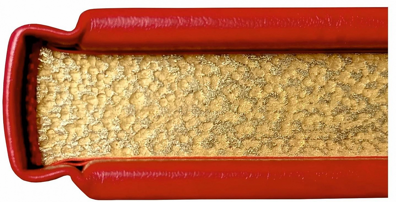Переплет ручной работы. Натуральная переплетная кожа. Каптал из шелковых нитей. Ляссе шелковое. Обрез торшонированный золотой фольгой. Украшение переплета: тиснение полиграфической фольгой, блинтовое тиснение.