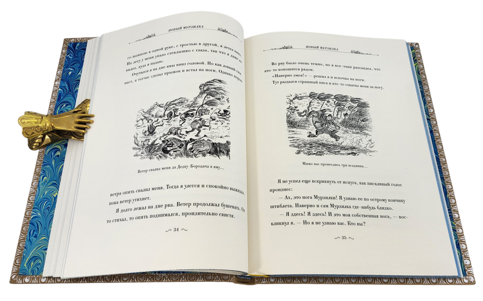 Подарочная книга "Новый Мурзилка" Палмер Кокс (Эксклюзивное исполнение) АННОТАЦИЯ Имена таких известных персонажей, как Мурзилка, Знайка и Незнайка ввела в русскую литературу детская писательница Анна Борисовна Хвольсон (1868-1934). Самая известная книжка Анны Хвольсон «Царство малюток. Приключения Мурзилки и лесных человечков» создана по мотивам рисунков - комиксов канадского художника и писателя Палмера Кокса (1840-1924). Кокс начал печатать шуточные рисунки о малютках в 1879 году. Всего за свою жизнь художник нарисовал 16 книг о похождениях маленького народца. Забавные рисунки сопровождались стихами, и приключения маленьких, довольно вредных, но симпатичных человечков стали известны во всем мире. Главным героем стал настырный врунишка Чолли Бутоньер, одетый во фрак, лаковые штиблеты и цилиндр. Как же случилось, что этот персонаж с моноклем стал предком знаменитого советского Мурзилки? В 1887 году петербурженка Анна Хвольсон ждала рождения первенца. В руки ей попался один из журналов с картинками Кокса, и она решила сочинить собственную историю про «эльфов – малюток». Вскоре Анна написала сказку «Мальчик с пальчик, девочка с ноготок», которую написал журнал «Задушевное слово». Текст Хвольсон вполне оригинален: например, у нее появилась героиня женского пола, а у Кокса все малютки – сплошь мужички. Иллюстрировать свою сказку Анна решила рисунками канадца, поэтому многих персонажей она взяла из англоязычного первоисточника. Своим героям она придумала русские имена. В сказке появились Знайка и Незнайка, доктор Мазь-Перемазь, Пуговка, Вертушка и другие персонажи. Главным героем был по-прежнему хвастун и врунишка, и Анна Хвольсон придумала ему новое имя. Так Чарли Бутоньер стал Мурзилкой. Откуда взялось это слово – Мурзилка? Изданный Академией наук СССР «Словарь русских народных говоров» (1982) сообщает, что в Псковской и Смоленской губерниях так называли людей маленького роста. Хвольсон решила, что слово прекрасно подходит для имени маленького сказочного человечка. В 1889 году вышла книга «Царство малюток». Издание объединяло 27 историй о сказочном народце, иллюстрациями по-прежнему служили картинки Палмера. До 1915 года книга выдержала несколько переизданий, но уже под названием «Приключение Мурзилки и лесных человечков». Популярность книг была столь велика, что позднее несколько авторов продолжили сочинять новые приключения её Мурзилки. В 1913 году по комиксам Палмера Кокса была опубликована повесть с иллюстрациями автора и русским текстом С. Мунда «Новый Мурзилка. Удивительные приключения и странствия маленьких лесных человечков». Имена коротышек были взяты из книги Анны Хвольсон. В нашем распоряжении оказалась эта книга, дважды выходившая в издательстве М. О. Вольфа – в 1913 и 1916 годах. Её переиздание мы и предлагаем вниманию читателей. ОПИСАНИЕ Литературно- художественное издание. Коллекционное: тираж 100 номерных экземпляров. Иллюстрации автора. Особенностью данного издания является крупный, удобочитаемый шрифт. Эксклюзивное исполнение переплёта: Книга исполнена по старинной французской технологии; блок сшит на шнурах; Переплет цельнокожаный, с вставками из шагреневой кожи; Бумага дизайнерская, тонированная в массе; Переплетная крышка декорирована художественным тиснением и элементами ручной росписи по коже; Форзац выполнен