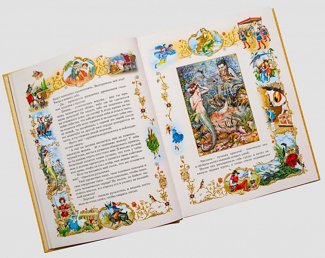 Лучшее в истории книгопечатания издание сказок народов мира. Огромное количество ярких, богатых самыми различными оттенками и мельчайшими деталями иллюстраций великолепных художников XIX века и современных художников, большинство из которых публикуются в России впервые, поразит воображение даже самого искушенного ценителя книги. Сочетание трехстороннего золотого обреза, великолепного переплета, тисненного фольгой 10 различных цветов, шелкового ляссе и страниц, украшенных рамкой из роскошных цветных иллюстраций, завершает оформление издания, которое, несомненно, станет подлинной жемчужиной любой, даже самой изысканной, коллекции и библиотеки в мире.