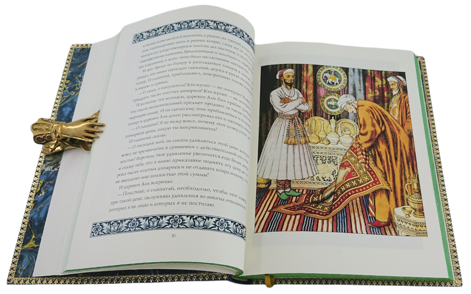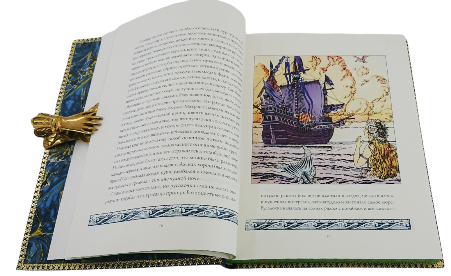 Подарочная книга "Сказки и поэма в иллюстрациях И. Я. Билибина" АННОТАЦИЯ Содержание: Русские народные сказки; «Ковёр-самолёт»; Г. Х. Андерсен «Русалочка»; М.Ю. Лермонтов «Песня про купца Калашникова». ОПИСАНИЕ Особенности оформления и переплета: • Книга исполнена по старинной французской технологии; • Переплет цельнокожаный, из натуральной шагрени (Франция); • Бумага дизайнерская из коллекции «Olin», (Франция) • Блок сшит на пяти шнурах; • Переплетная крышка декорирована художественным многоцветным тиснением в стиле русского модерна; • Форзац выполнен из мраморной бумаги ручного крашения; • Дублюра окатана вручную 23-каратным золотом; • Обрез блока с художественным оформлением: окрашен и гравирован вручную; • Ляссе шелковое, каптал ручного плетения; • Индивидуальный футляр с кожаной окантовкой