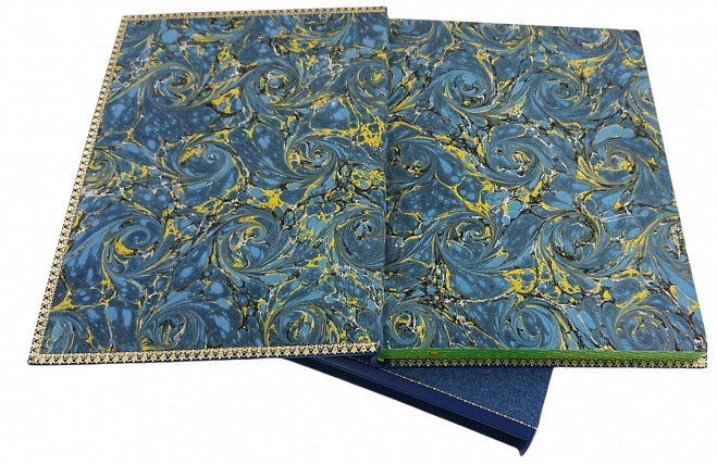 • Форзац выполнен из мраморной бумаги ручного крашения;