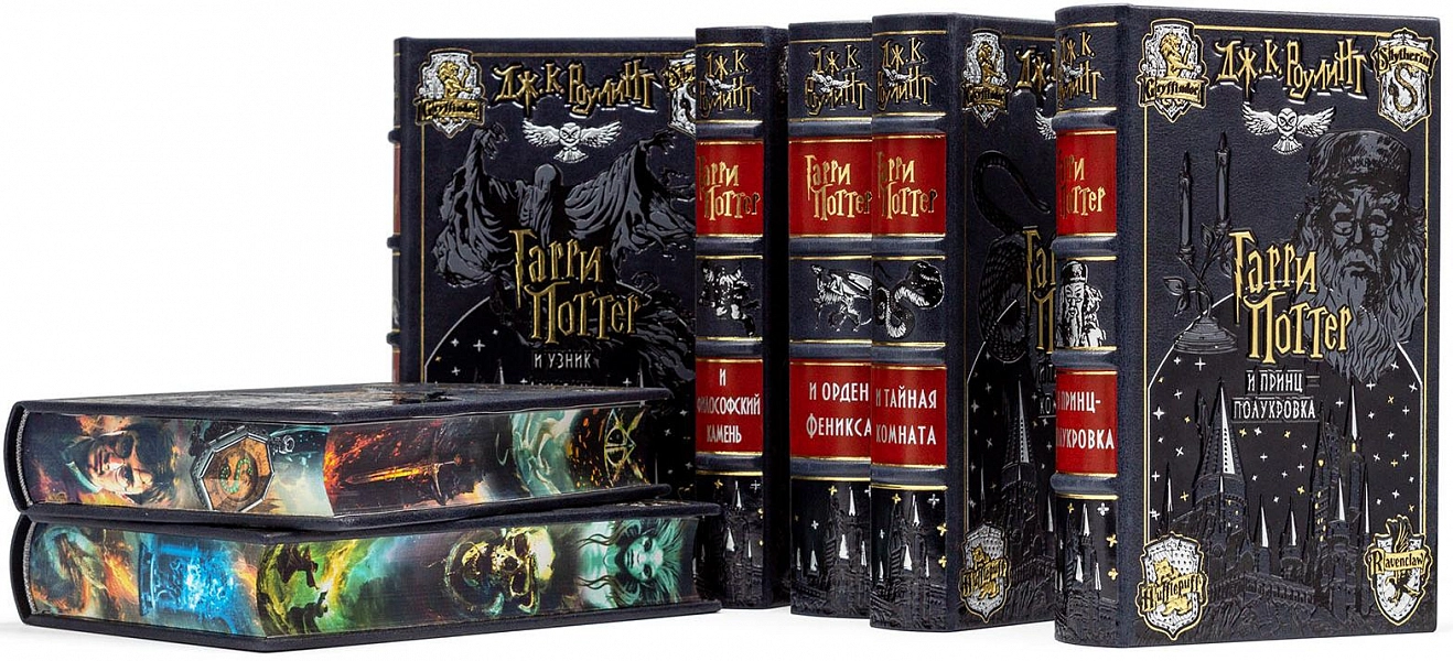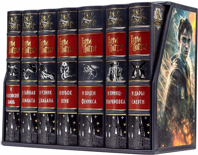 Подарочные книги "Гарри Поттер" (в 7-и томах) АННОТАЦИЯ Полное собрание книг о Гарри Поттере, облаченные в исторический, французский стиль кожаного переплета. Каждая книга с уникальным тиснением и оформлением книжного блока. Желаем вам прекрасного погружения в мир магии и волшебства! ОПИСАНИЕ Исторический французский стиль переплета, каждый том имеет специально разработанный дизайн тиснения. Книжные блоки вручную отшлифованы, на обрезы страниц нанесены тематические рисунки. Список книг: 1. Гарри Поттер и Философский Камень 2. Гарри Поттер и Тайная Комната 3. Гарри Поттер и Узник Азкабана 4. Гарри Поттер и Кубок Огня 5. Гарри Поттер и Орден Феникса 6. Гарри Поттер и Принц-Полукровка 7. Гарри Поттер и Дары Смерти