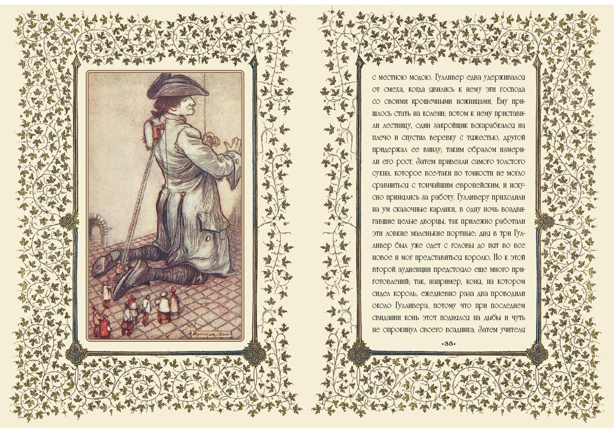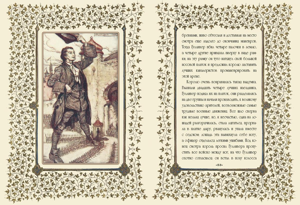 Книга в кожаном переплете станет украшением вашей библиотеки. Остроумно, весело и драматично Свифт показал и свое, и – вот парадокс! – сегодняшнее время. Таково свойство большой литературы, которое в полной мере проявилось в бессмертной книге. Иллюстрации: Артур Рэкхем (Arthur Rackham, 1867 – 1939), Карл Оффердингер (Carl Offterdinger, 1829 – 1889).