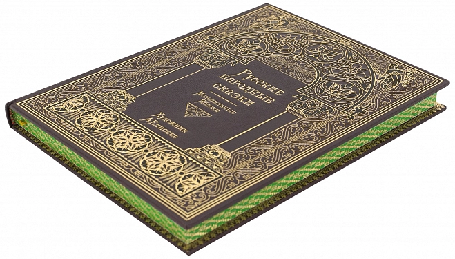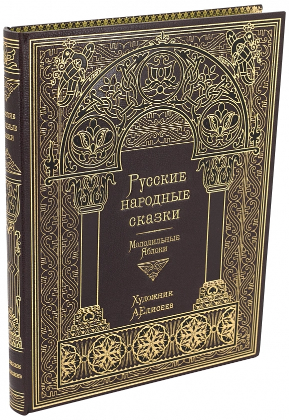 РУССКИЕ НАРОДНЫЕ СКАЗКИ. СБОРНИК «МОЛОДИЛЬНЫЕ ЯБЛОКИ» (ХУД. А. ЕЛИСЕЕВ) АННОТАЦИЯ Коллекционное издание. Эксклюзивное исполнение. Тираж 100 номерных экземпляров. Москва. 2020. Специально для этого издания были приобретены права на использование рисунков Народного художника Российской Федерации Анатолия Елисеева. Печать в точности соответствует оригиналам иллюстраций. ОФОРМЛЕНИЕ Книга исполнена по старинной французской технологии; Переплет цельнокожаный, из натуральной шагрени (Франция); Бумага дизайнерская из коллекции «Olin», (Франция) Блок сшит на пяти шнурах; Переплетная крышка декорирована художественным многоцветным тиснением в стиле русского модерна; Форзац выполнен из мраморной бумаги ручного крашения; Дублюра окатана вручную 23-каратным золотом; Обрез блока с художественным оформлением: окрашен и гравирован вручную; Ляссе шелковое, каптал ручного плетения; Индивидуальный футляр с кожаной окантовкой.