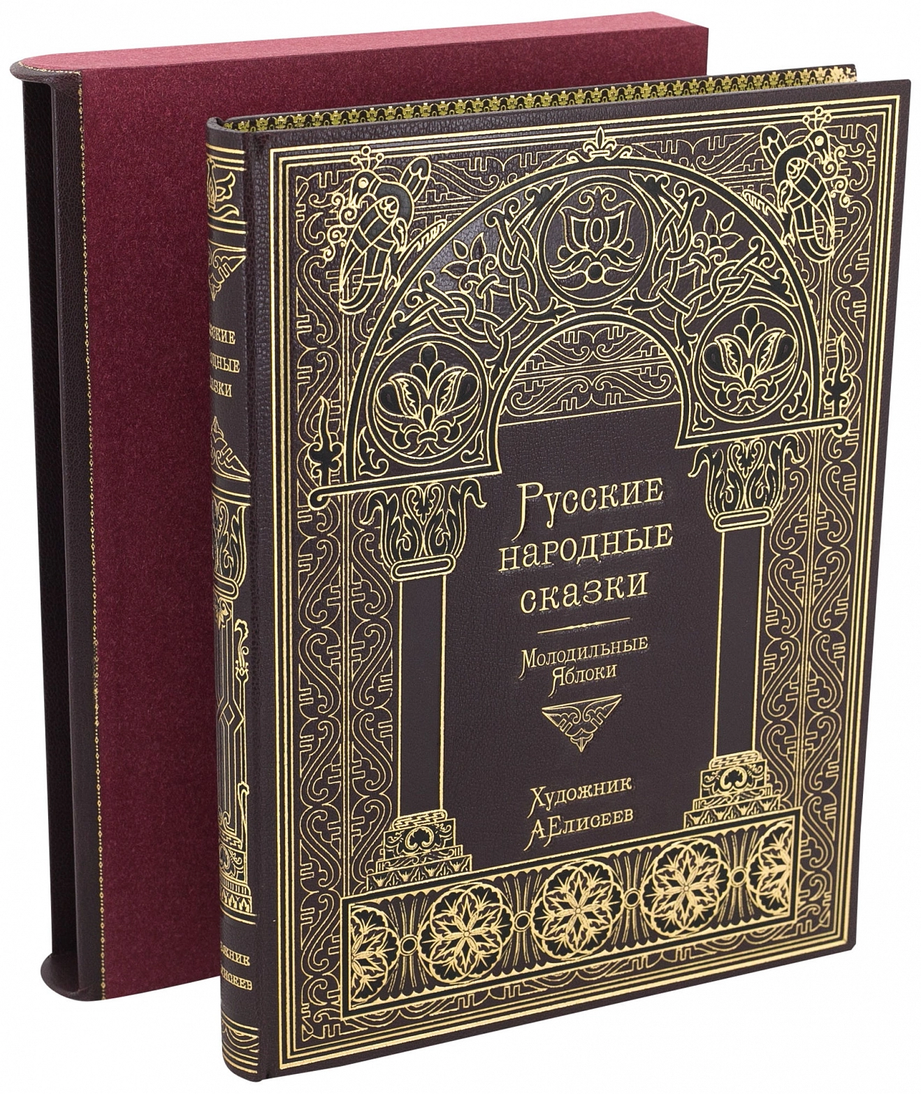 РУССКИЕ НАРОДНЫЕ СКАЗКИ. СБОРНИК «МОЛОДИЛЬНЫЕ ЯБЛОКИ» (ХУД. А. ЕЛИСЕЕВ) АННОТАЦИЯ Коллекционное издание. Эксклюзивное исполнение. Тираж 100 номерных экземпляров. Москва. 2020. Специально для этого издания были приобретены права на использование рисунков Народного художника Российской Федерации Анатолия Елисеева. Печать в точности соответствует оригиналам иллюстраций. ОФОРМЛЕНИЕ Книга исполнена по старинной французской технологии; Переплет цельнокожаный, из натуральной шагрени (Франция); Бумага дизайнерская из коллекции «Olin», (Франция) Блок сшит на пяти шнурах; Переплетная крышка декорирована художественным многоцветным тиснением в стиле русского модерна; Форзац выполнен из мраморной бумаги ручного крашения; Дублюра окатана вручную 23-каратным золотом; Обрез блока с художественным оформлением: окрашен и гравирован вручную; Ляссе шелковое, каптал ручного плетения; Индивидуальный футляр с кожаной окантовкой.