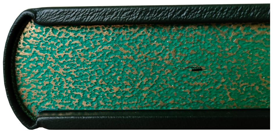Французский цельнокожаный переплет ручной работы на шнурах. Натуральная переплетная кожа. Форзац составной на кожаной слизуре. Дизайнерская бумага. Каптал двойной наборный, ручное плетение из шелковых нитей. Обрез торшорированный золотой фольгой. Ляссе шелковое. Тиснение полиграфической фольгой.