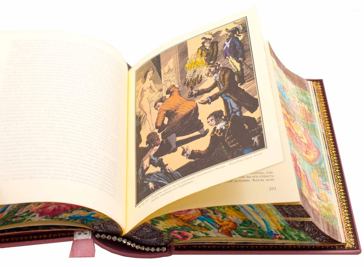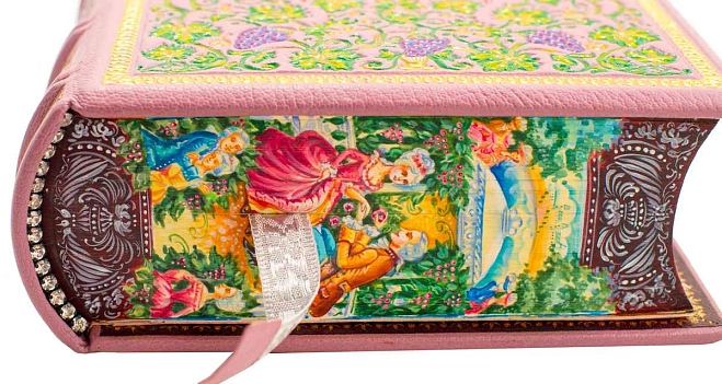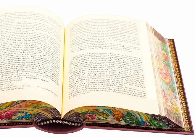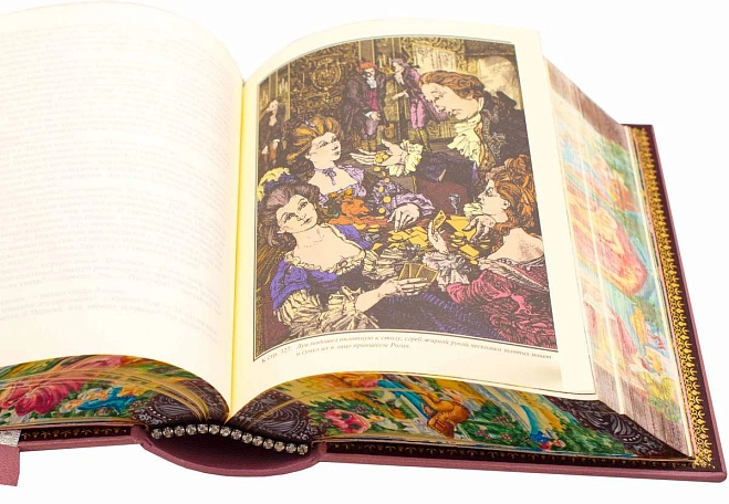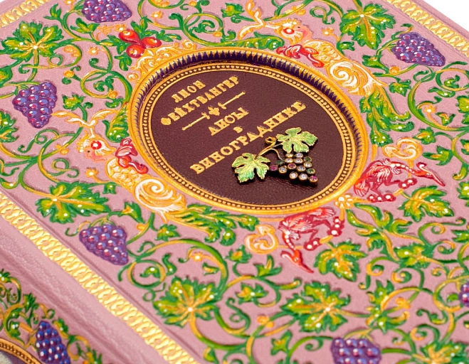 Переплет из французской кожи CHIVRE BRETEUIL. Обложка и обрез книги расписаны вручную. Тиснение на крышке произведено 24 каратным золотом. Блок напечатан на бумаге ACQUERELLO AVORIO. Иллюстрации отпечатаны на итальянской бумаге TINTORETTO CREMA. Книга инкрустирована позолоченной виноградной гроздью, изготовленной из серебра и фионитов. Шелковое дизайнерское ляссе. Каптал инкрустирован кристаллами.
