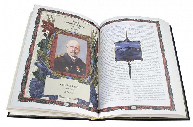 АРМИЯ И ФЛОТ АННОТАЦИЯ Книга посвящена наиболее выдающимся полководцам, добывавшим боевую славу для своей родины на полях крупнейших битв и морских сражений. Тема книги – вся российская военная история, начиная с Х века по нынешнее время. ИСПОЛНЕНИЕ Переплёт ручной работы из натуральной кожи. Форзац из дизайнерской бумаги. 4 бинта на корешке, ручной обработки. Каптал золотой из натуральной кожи. Обрез блока торшонированный золотой. Тиснение блинтовое, золотой и цветной фольгой. Ляссе.