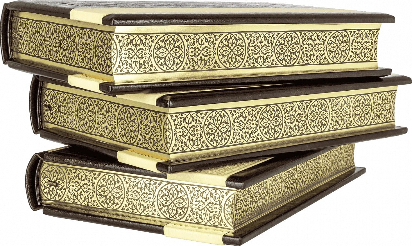 Составной переплет «Брадель» ручной работы, выполнен в комбинации натуральных кож «Robbat Cognac» и «Robbat Wisky» производства итальянской кожевенной фабрики «Claudio». Обложки книг и футляр оформлены многоуровневым тиснением: рельефным золотым и серебряным (фольги «Luxor 240»). Корешок кругленый с натуральными бинтами. Кожаный каптал и шелковые ленты-ляссе. Обрезы книг выполнены в авторской технике золочения с нанесением орнамента. Футляр устлан итальянским коттон-бархатом.
