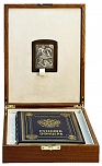 Подарочное издание в цельнокожаном переплете ручной работы. Золотое тиснение, блинт, обрез покрытый золочением. Ляссе. Богато оформленные дублюрами составные форзацы. Икона выполнена методом гальванопластики с серебрением поверхности, в сочетании с деревянной основой, ляссе из шелковой ленты.